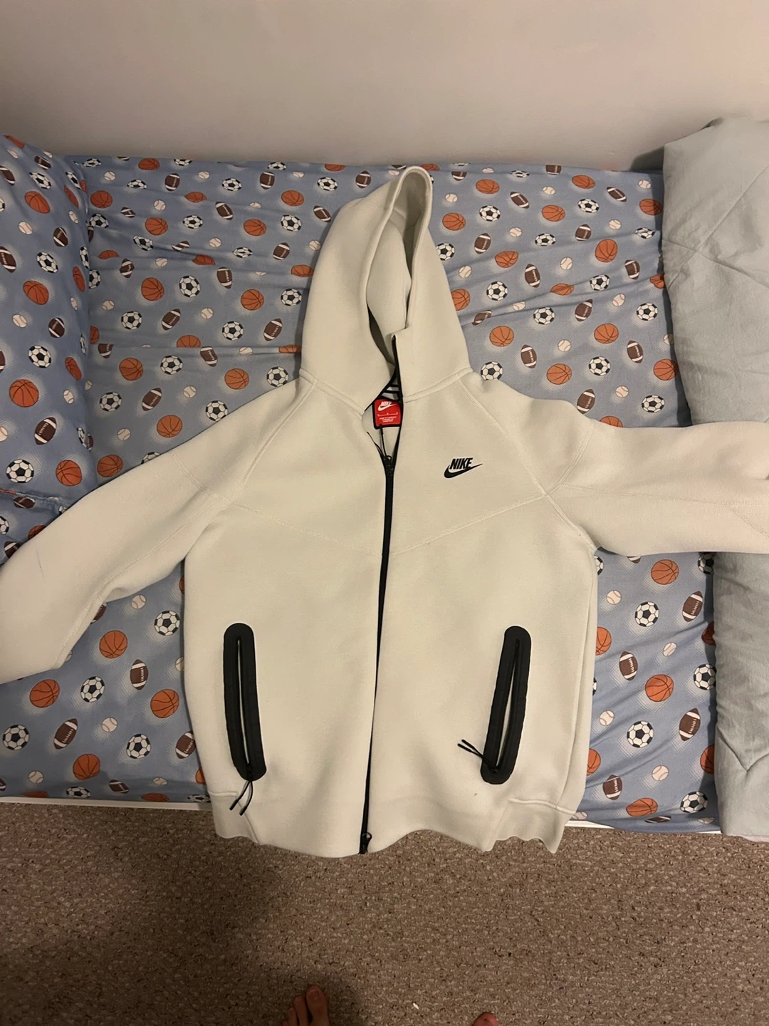 Selling a Nike Tech Fleece hoodie in size medium! It's in great condition and super comfy for everyday wear. The colour is a nice, neutral off-white that goes with everything. Perfect for layering or wearing on its own!