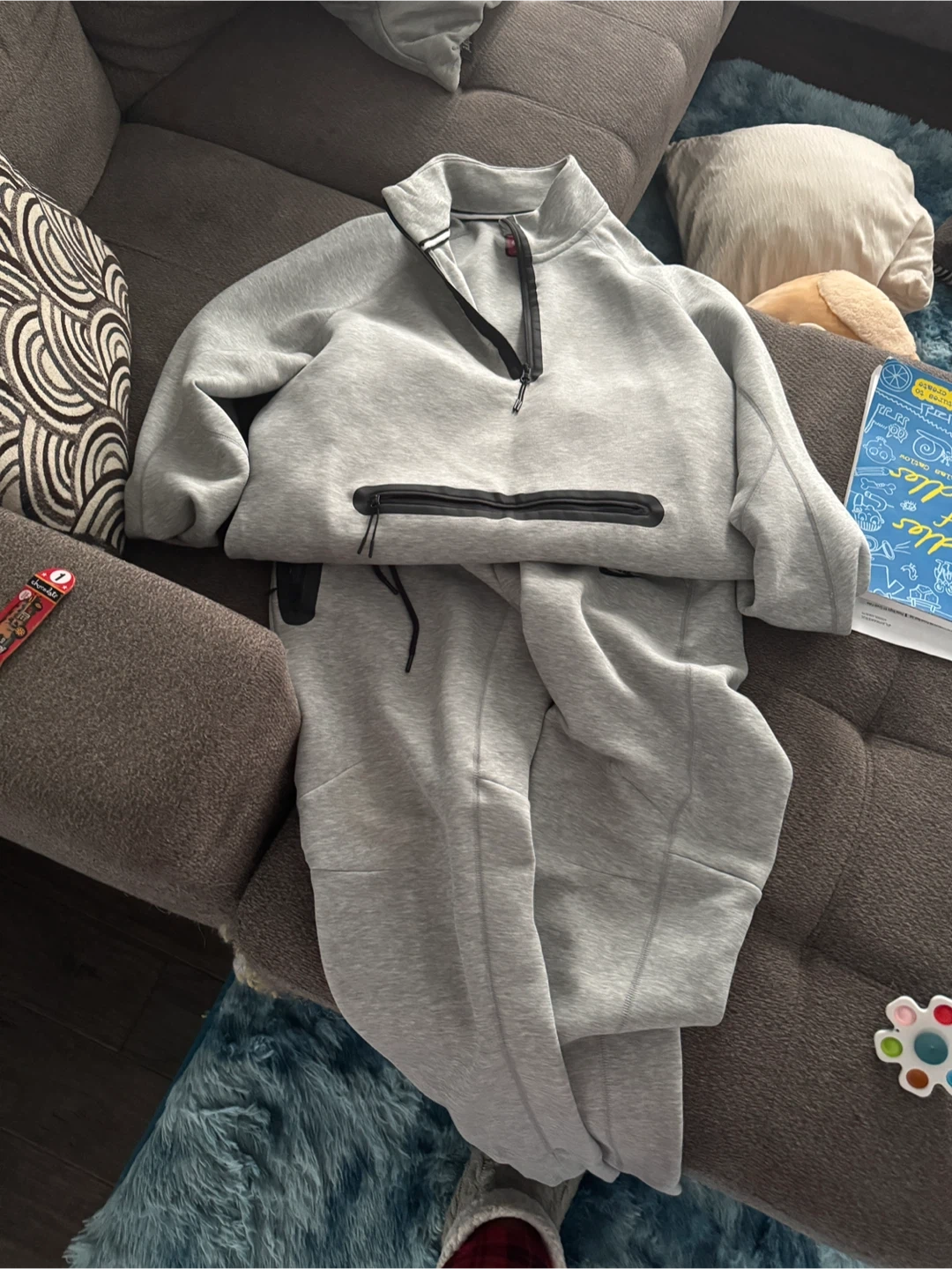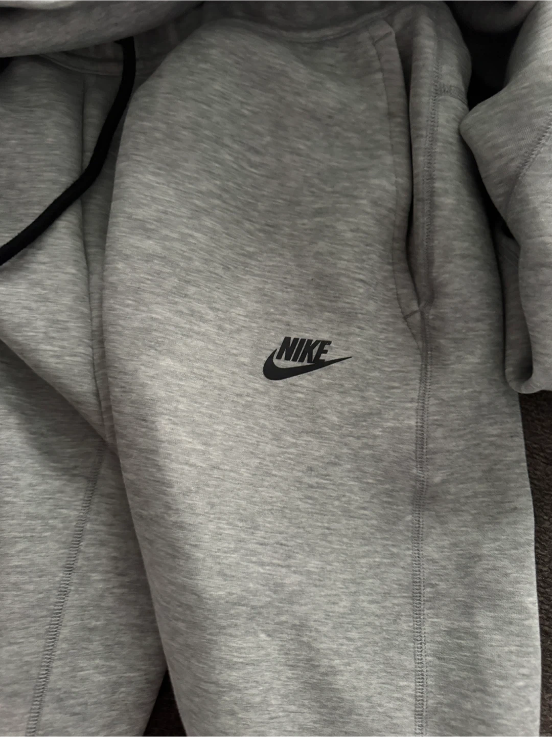 Selling a Nike Tech set in size large. It includes a pullover and matching pants, both in a light grey colour. The pullover has a zipper and a front pocket with a zipper as well. The pants are also size large and match the pullover perfectly!