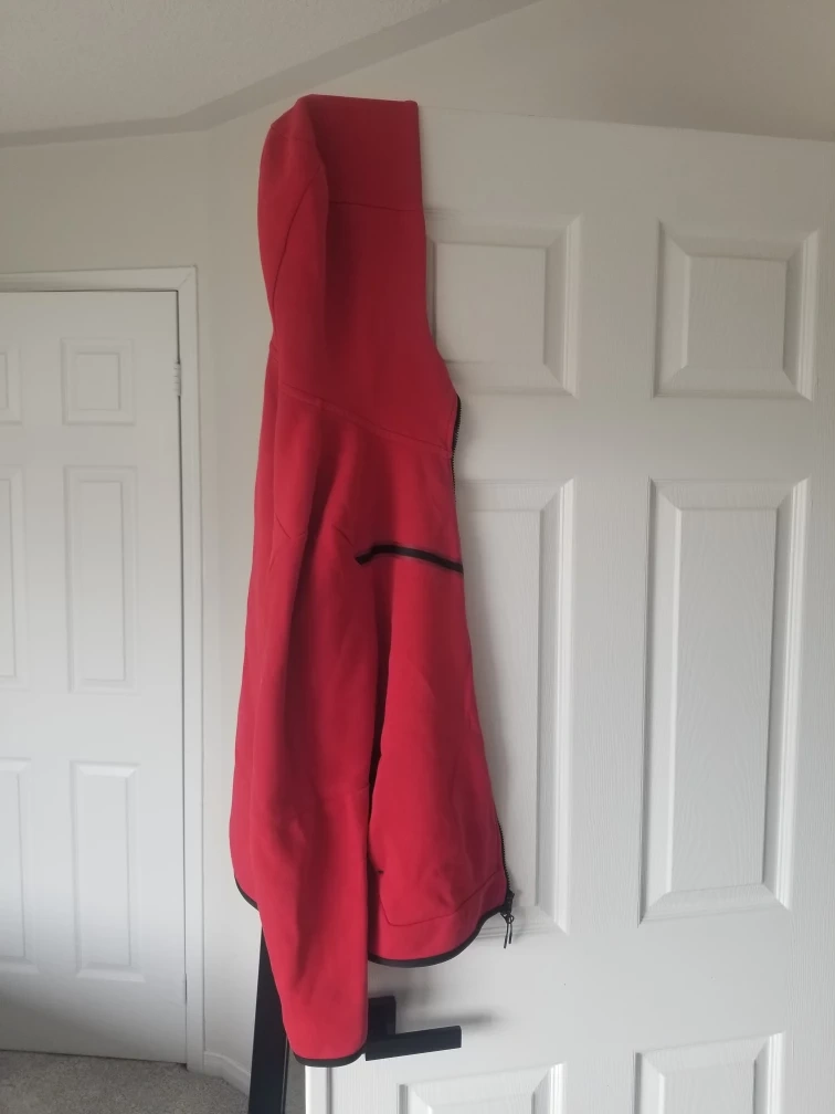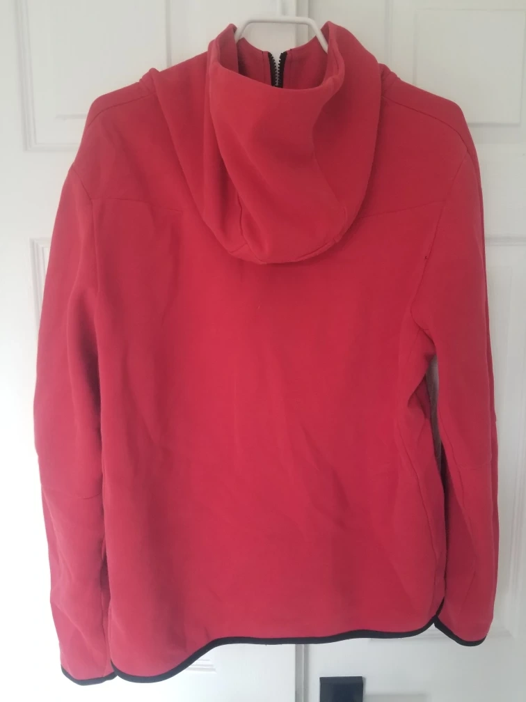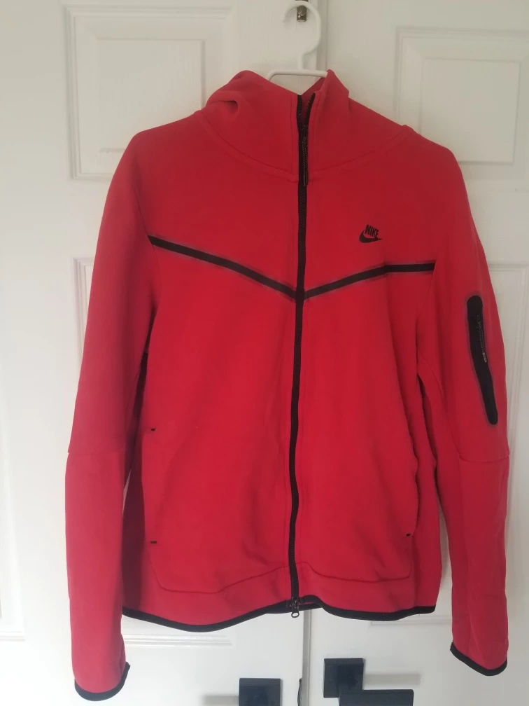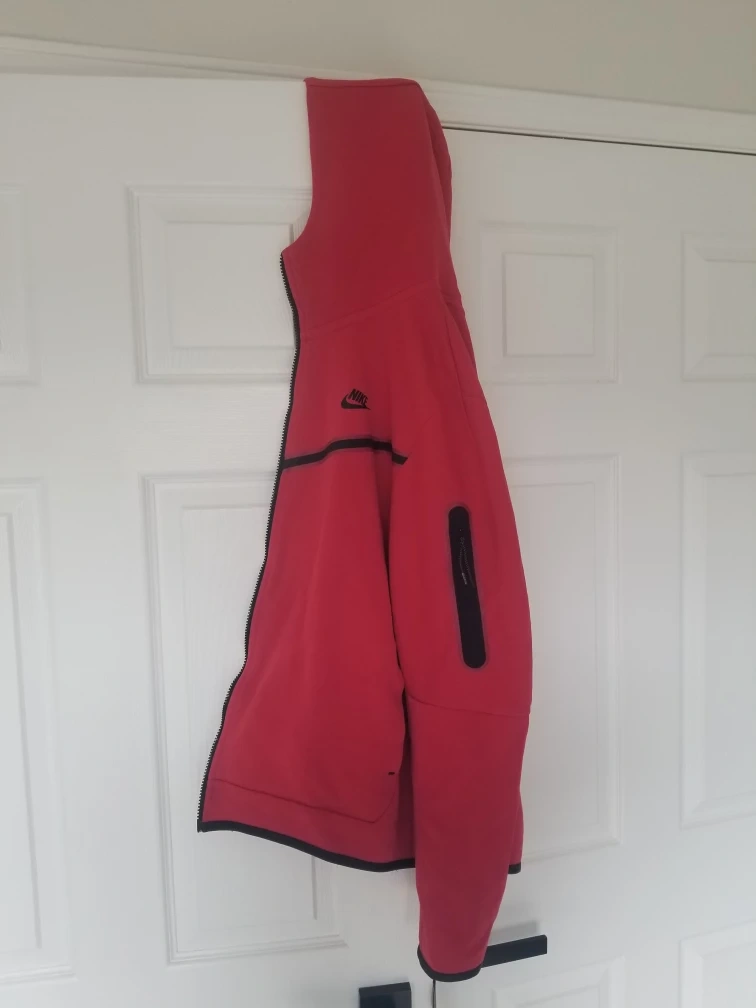 Selling a red Nike Tech hoodie in size large! It's in great condition and ready for a new home. Perfect for staying warm and stylish during those cooler days. The hoodie features the iconic Nike logo and a sleek design. Don't miss out!