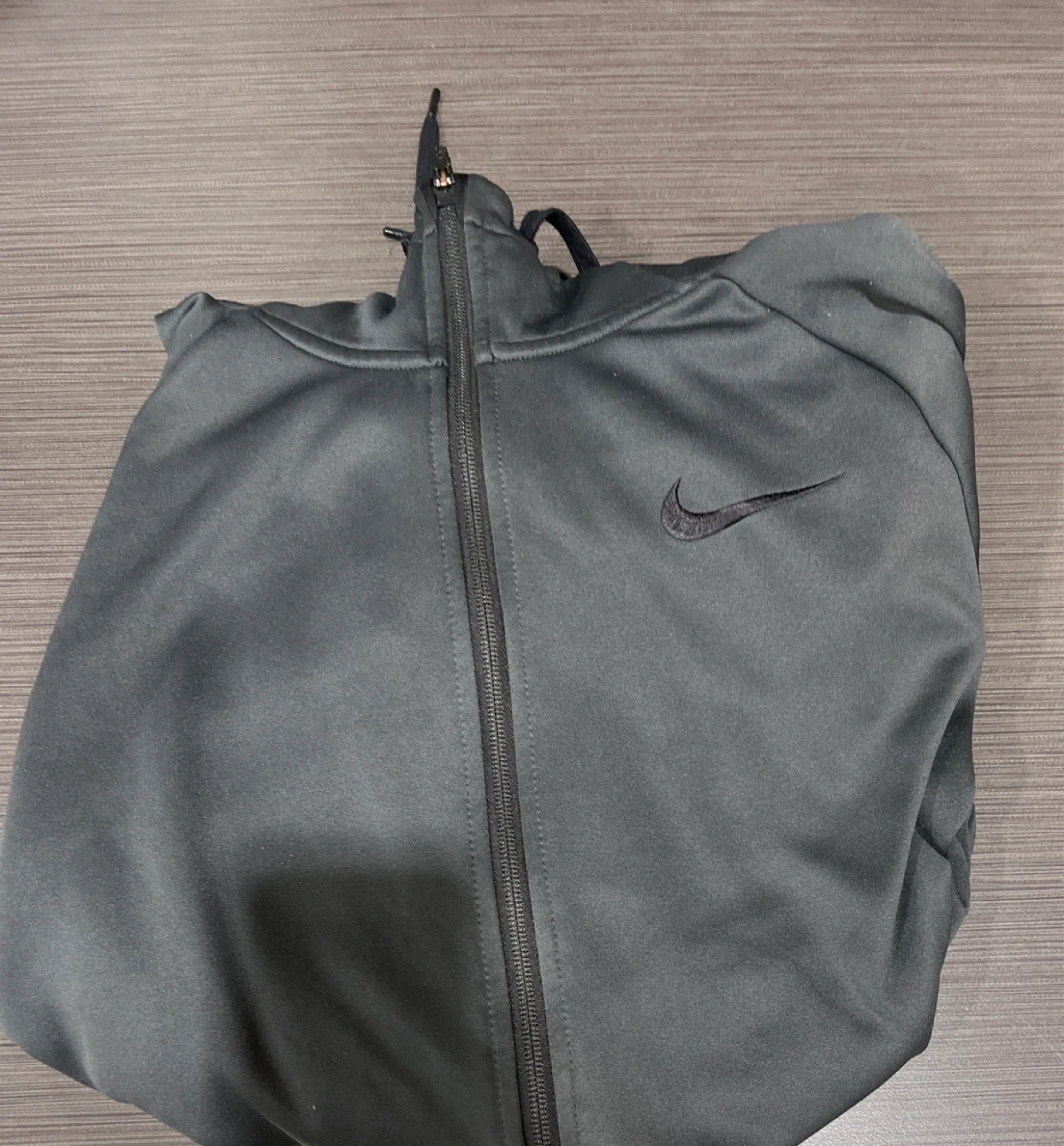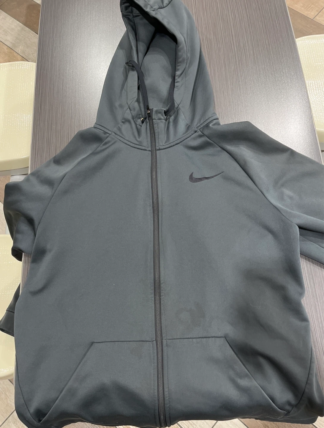 Selling a Nike Therma-FIT full-zip hoodie in grey! It's in great condition and perfect for staying warm during workouts or just lounging around.