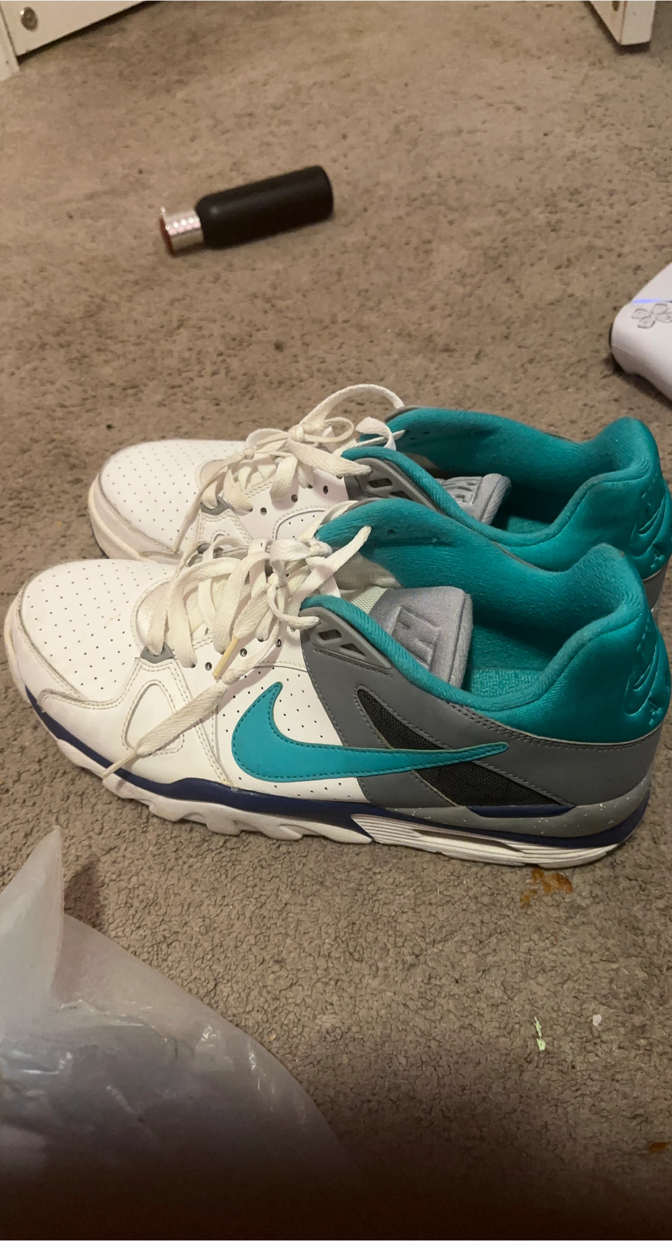 Selling a pair of Nike training shoes in white and teal. They show some signs of wear, but still have lots of life left in them. Perfect for working out or everyday wear! I live 4499 eclipse way