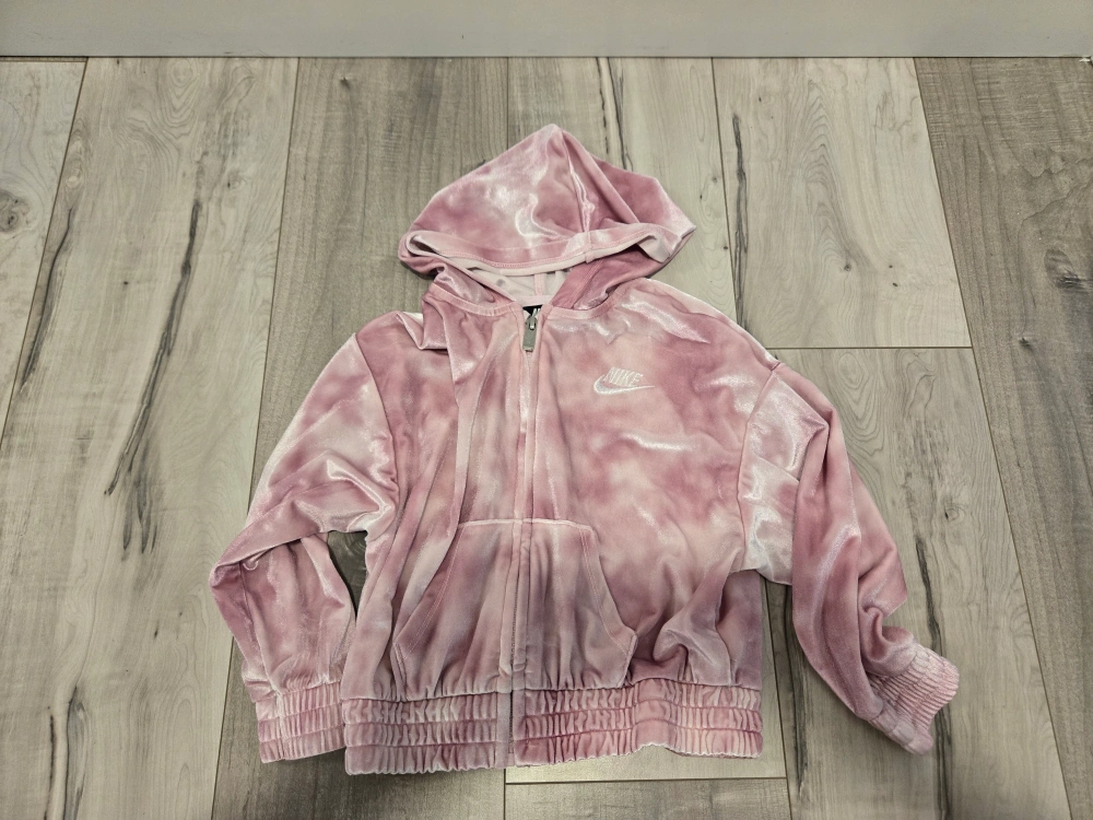 Selling a super soft Nike velour full zip hoodie. It's in great condition and perfect for little girls. it has a crop fit.. The colour is a lovely light pink. Size 4Y