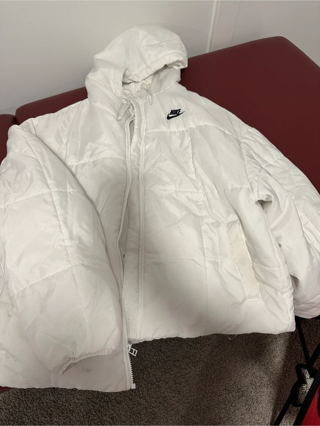 Selling a white Nike puffer jacket. It's in great condition and perfect for the colder weather. The jacket features the Nike logo and a hood for extra warmth. It's lightweight and comfortable, making it ideal for everyday wear size Large unisex White very white