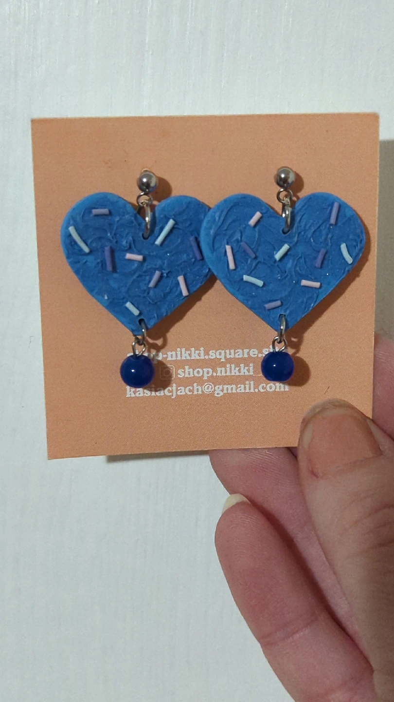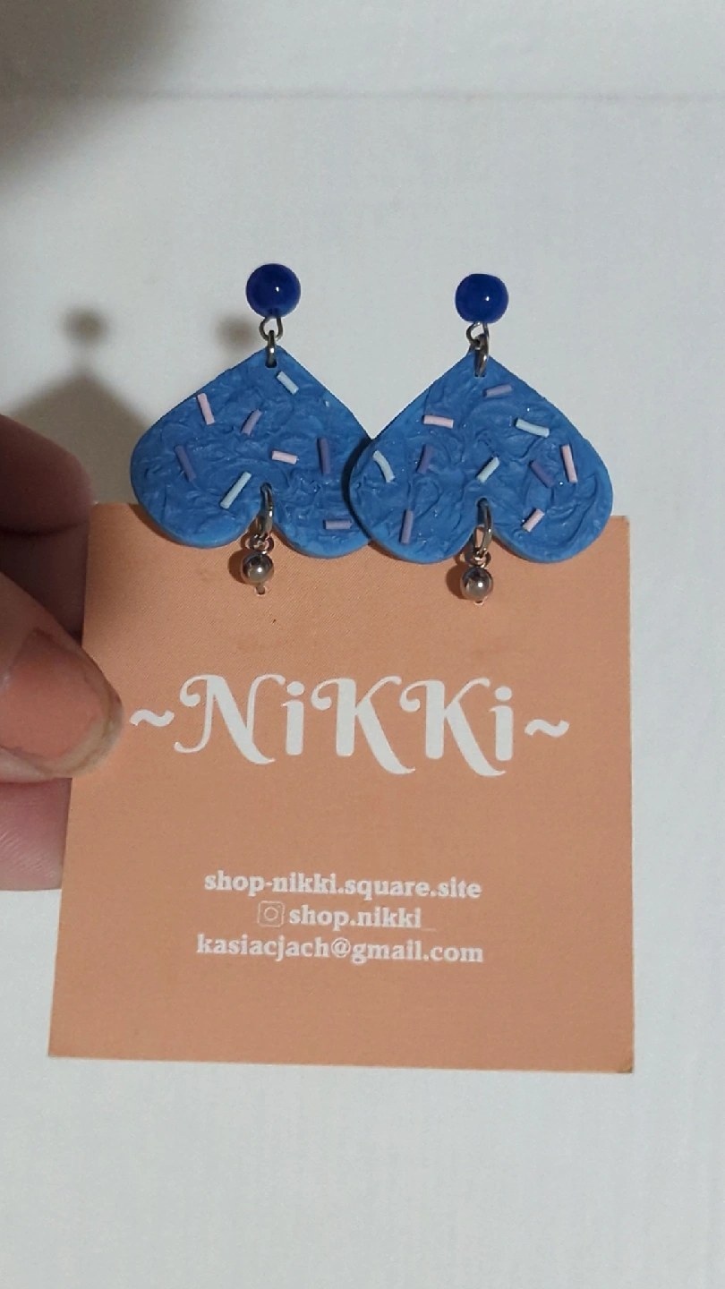 These are a pair of cute heart-shaped dangle earrings from Nikki! They are blue with little sprinkles on them. Perfect for adding a pop of colour to any outfit. PS.only tried on never really worn.