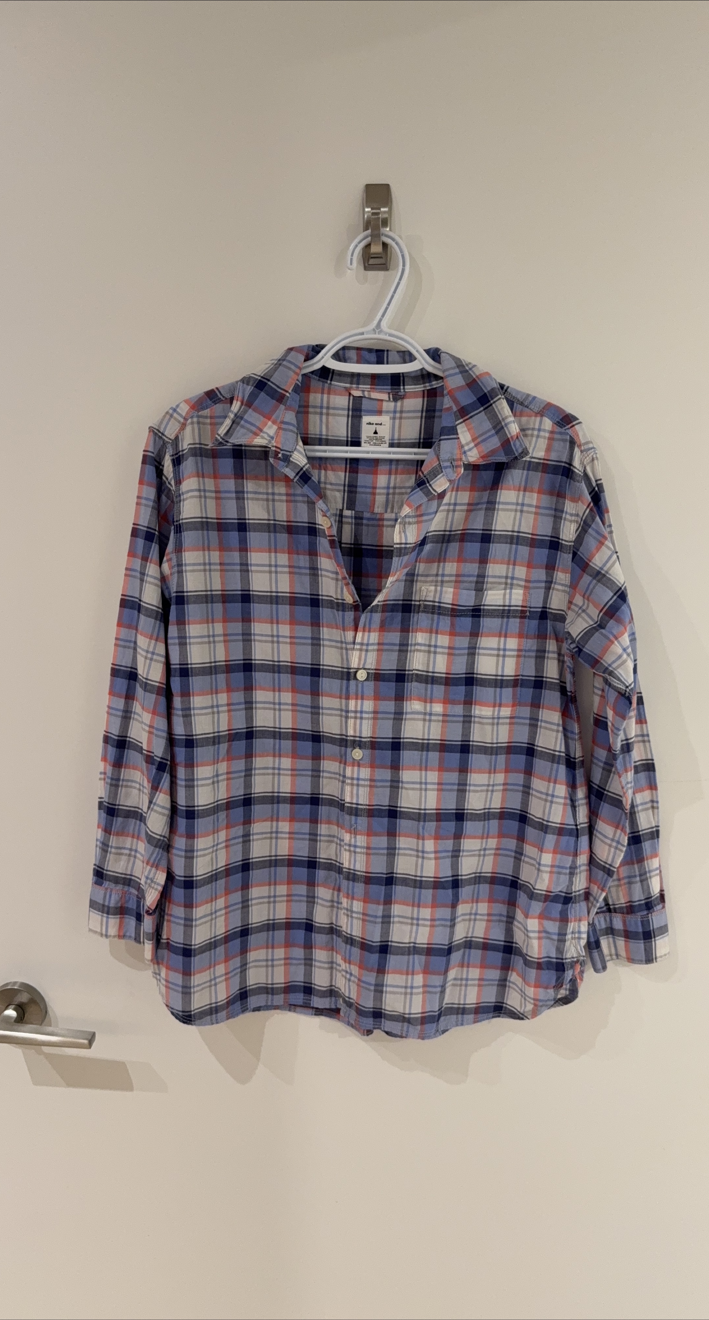 Here's a Niko and...(Japanese brand) plaid button-up shirt! It features a classic plaid pattern in shades of blue, white, and red. Great for a casual look!