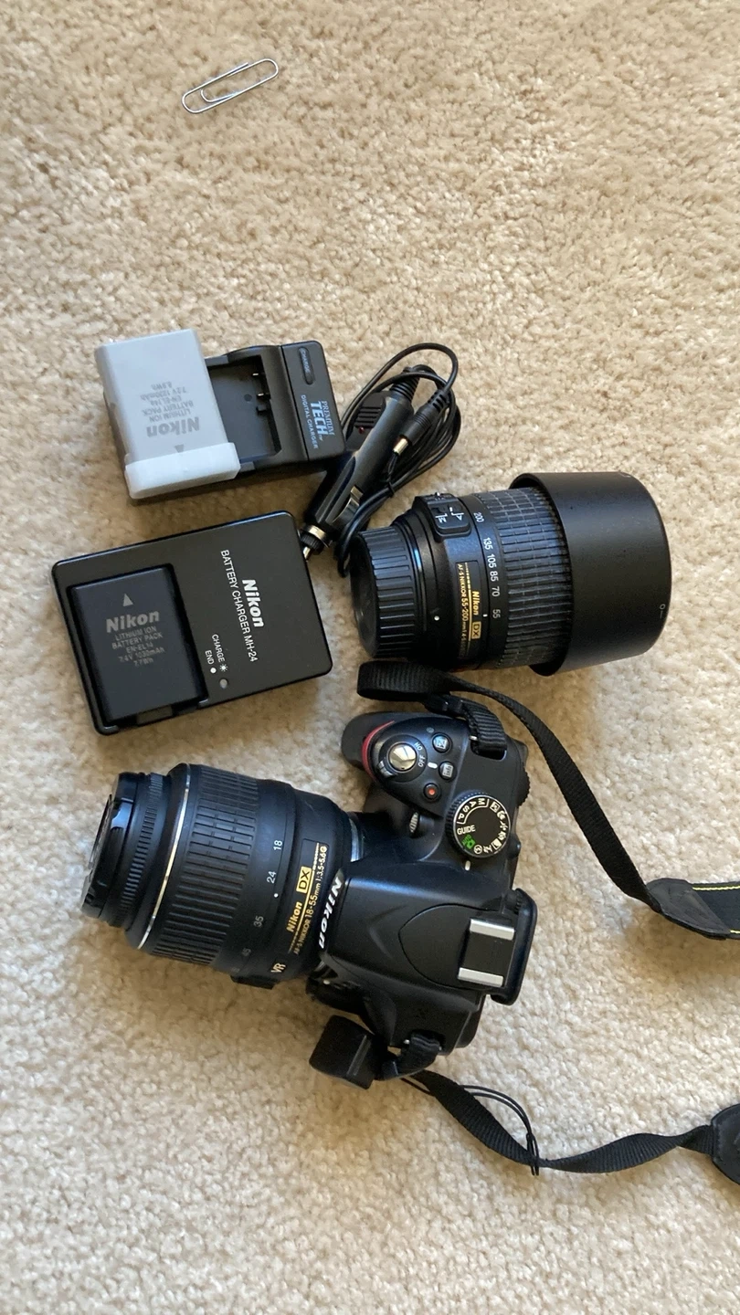 Nikon D3200 Nikkor 55-200 mm Nikkor 18-55 mm 2 batteriess with charger, a car charger Lowepro camera backpack