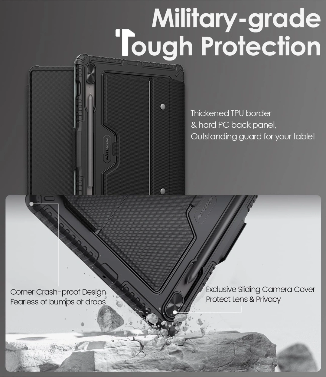 This Nillkin keyboard case is compatible with the Samsung Galaxy Tab S9 Plus and S10 Plus. It features a detachable laptop-like keyboard for comfortable typing with PC-like efficiency. Key features: - Enhanced multi-touch trackpad - Military-grade tough protection - Thickened TPU border and hard PC back panel - Exclusive sliding camera cover to protect lens and privacy - 7-color and 3-brightness backlighting - Scissor structure keys - Row of function keys