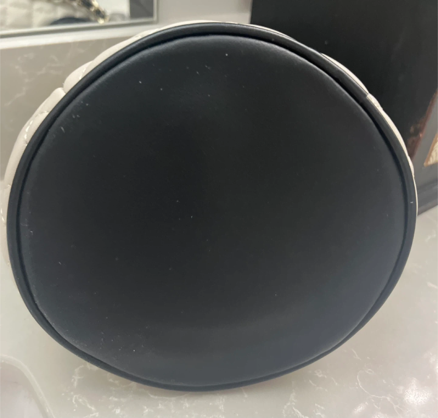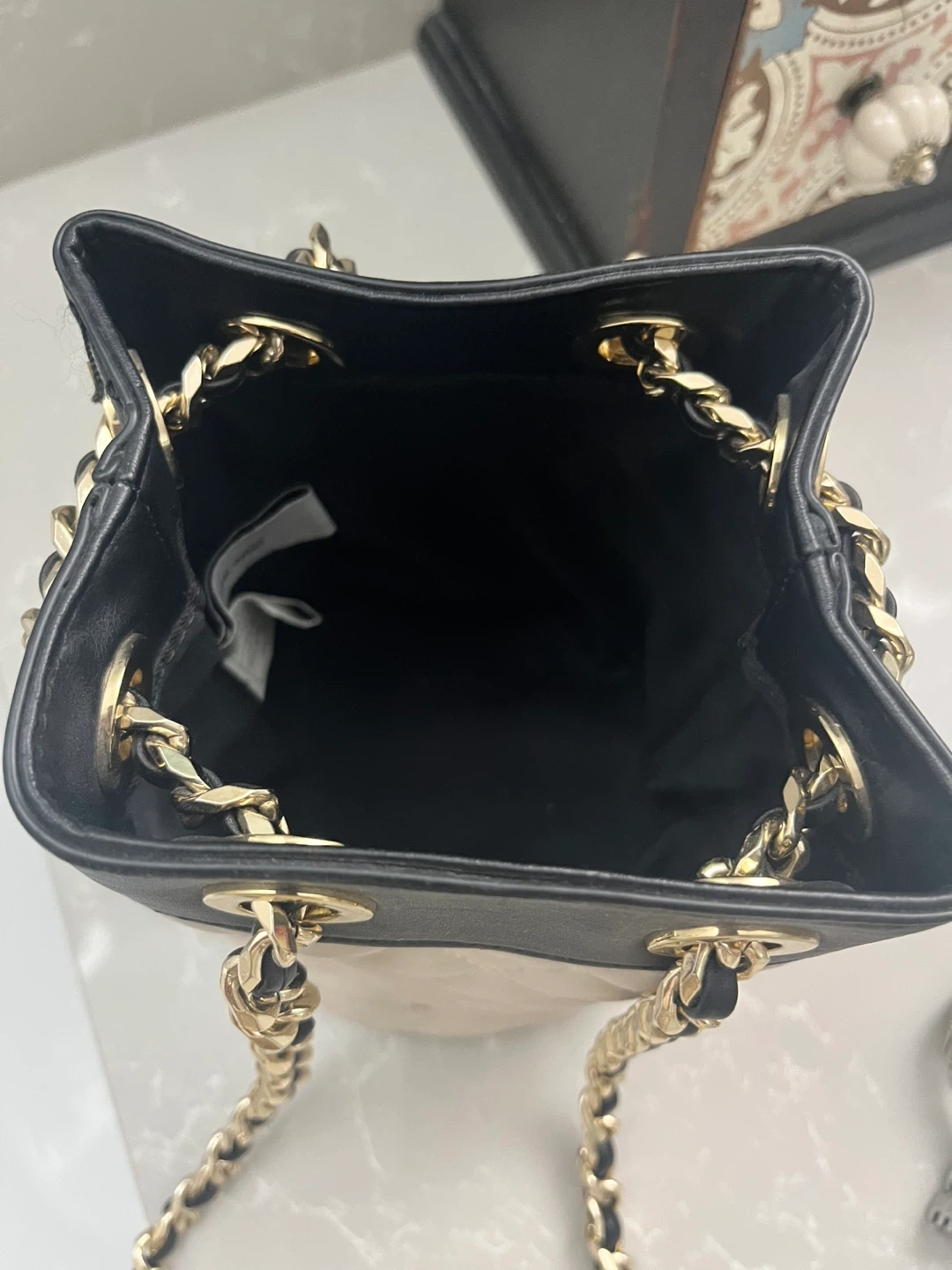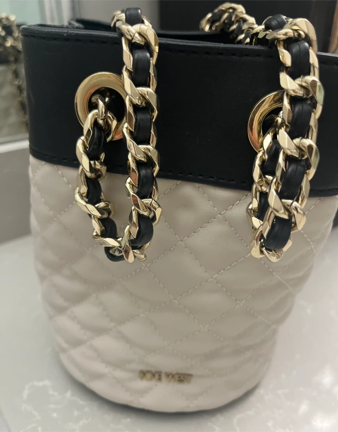 Selling a cute Nine West bucket bag! It's in great condition and features a cream quilted body, black top, and gold chain detailing. Perfect for everyday use!