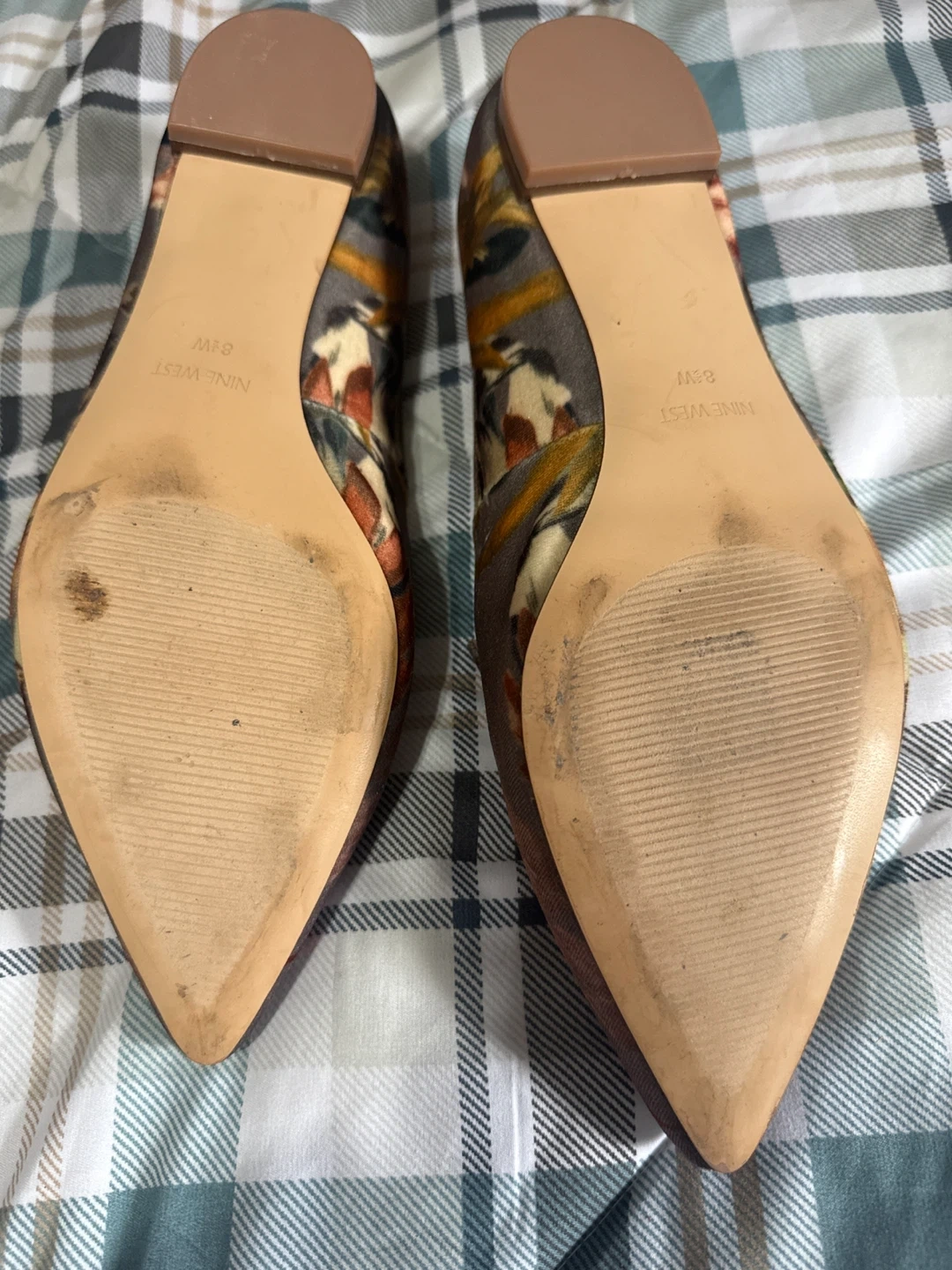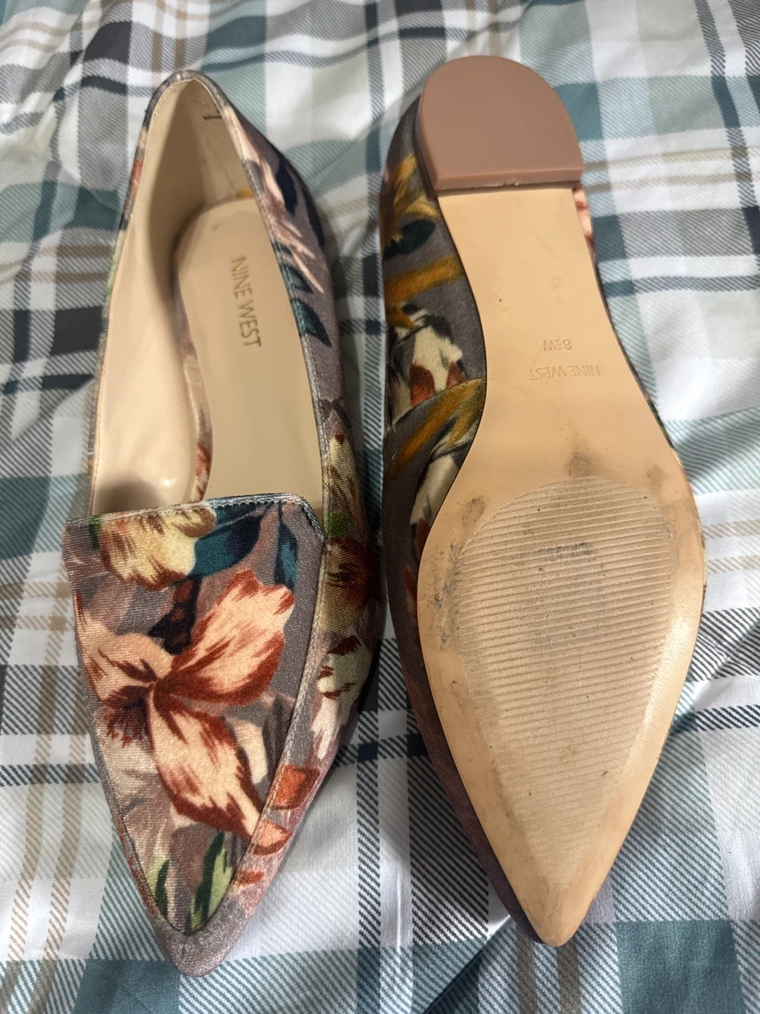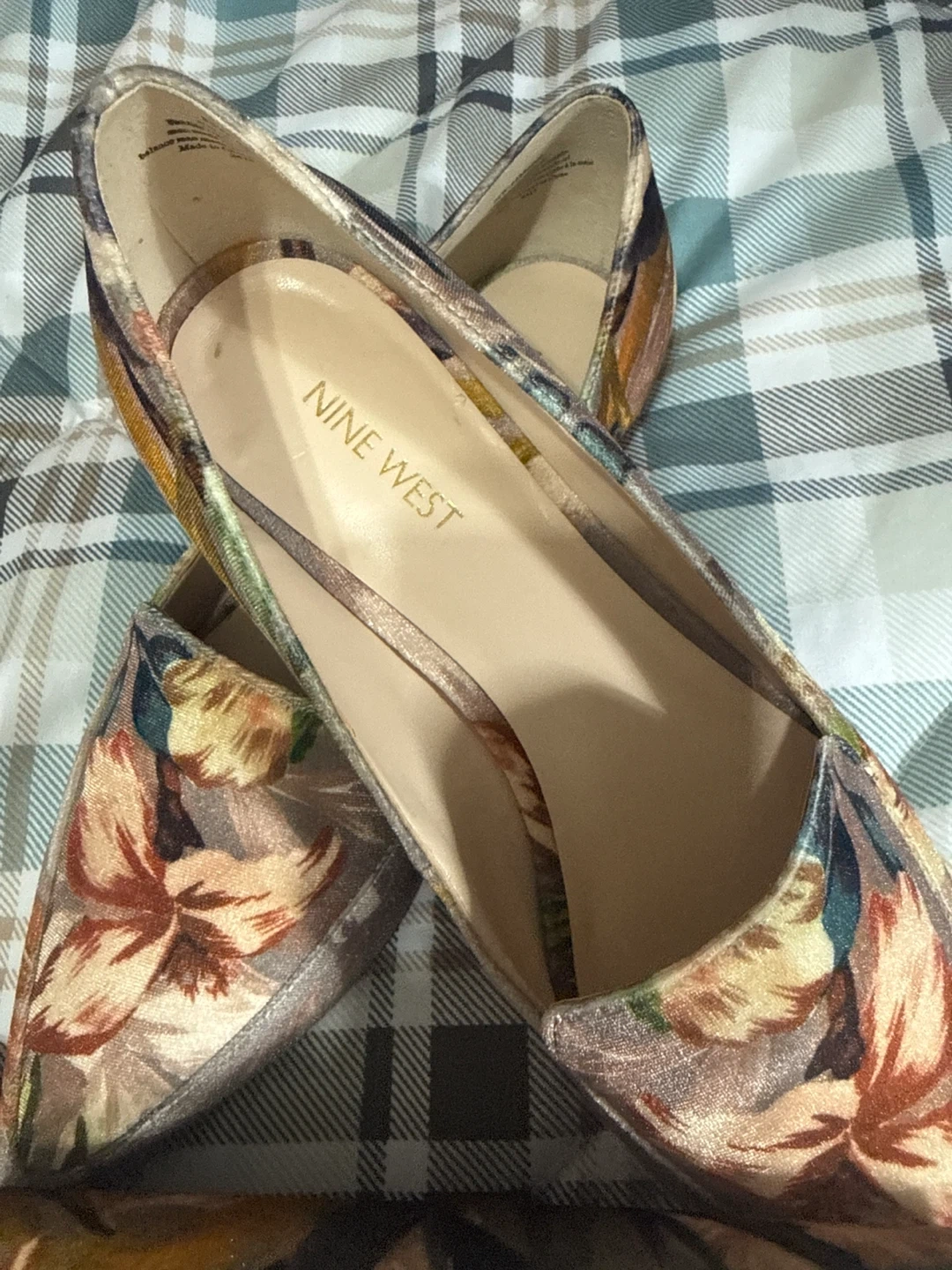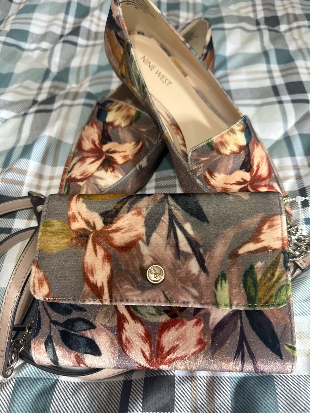 Selling a lovely set from Nine West! It includes a floral print purse with a chain strap and matching flats. Both are in great condition and have a unique, stylish design. Perfect for adding a touch of elegance to your outfit!