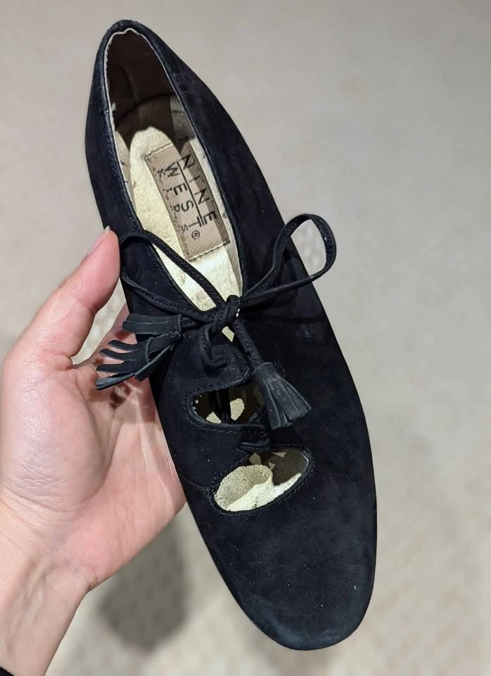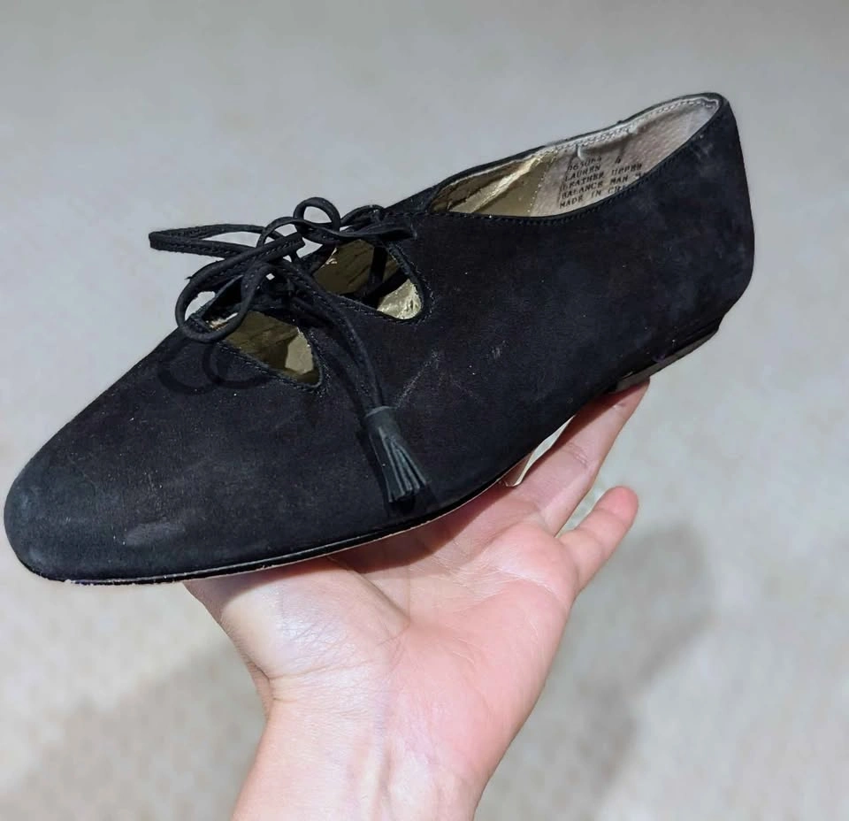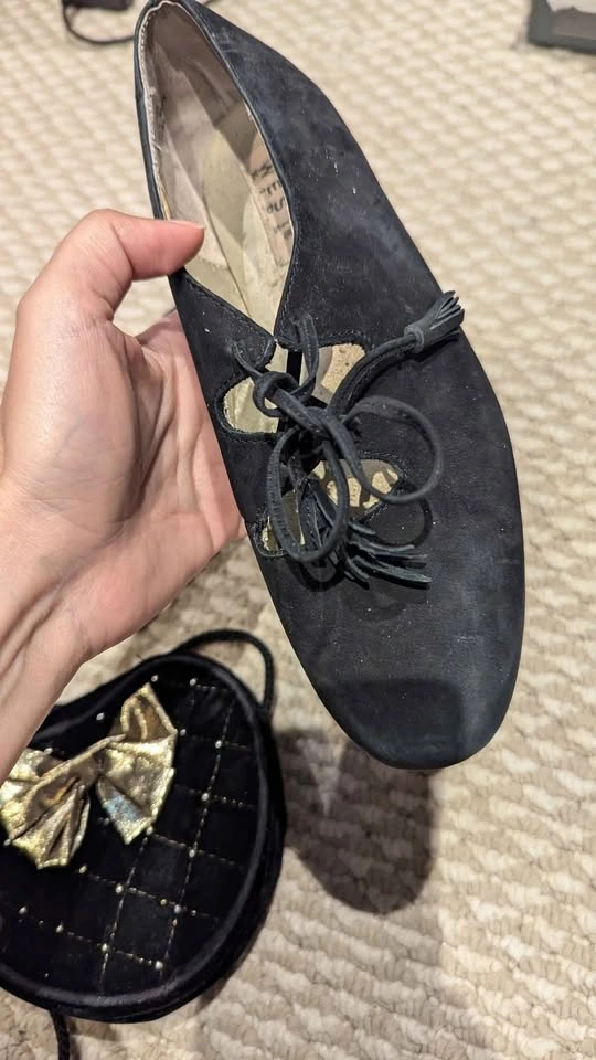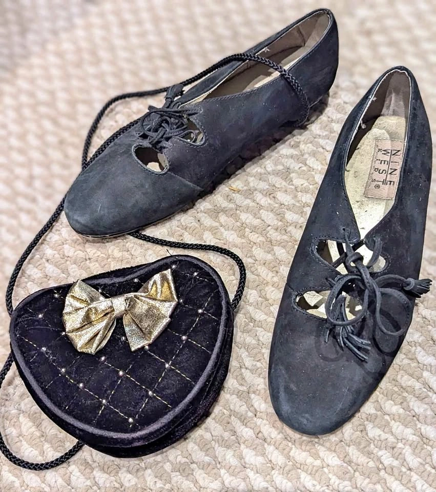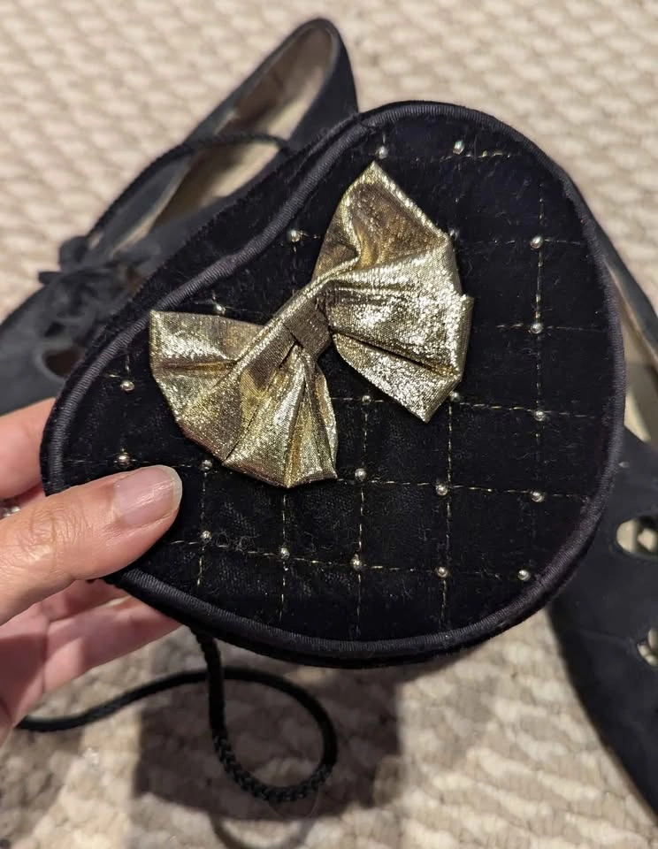 (Items sold together - $25 Total) Good gently used vintage condition, minor scuffs, some flaking in the gold shoe lining. Size 4 Kids โข 'LAUREN' style, Leather upper, black suede lace-ups Classic ghillie lace-up design with teardrop cut-outs and low block heel. Vintage 60s/Edwardian revival meets balletcore! Very stylish again now. ๐ ๐ค Paired with a bonus, quilted heart mini purse with gold-tone bow and studded grid!