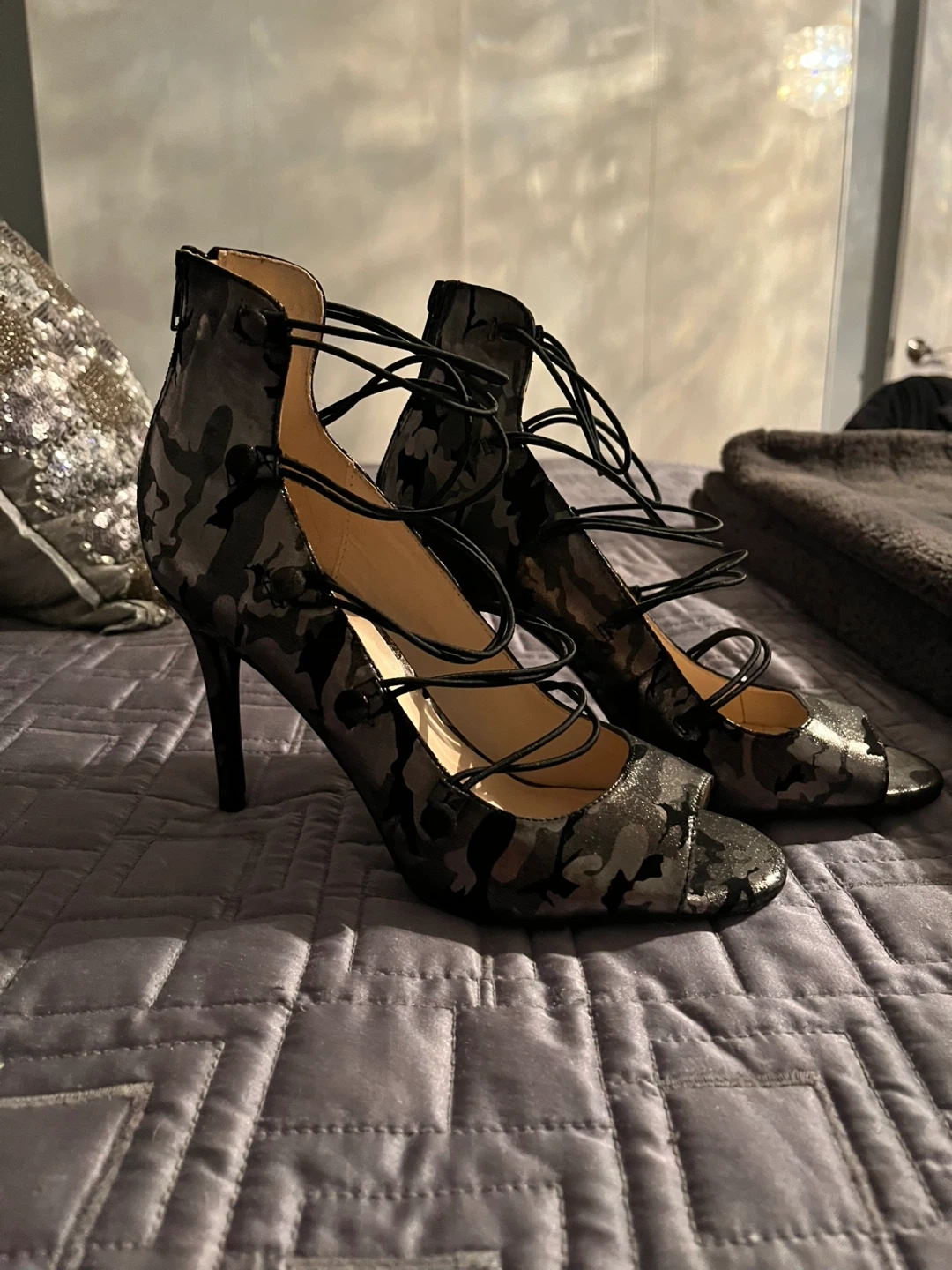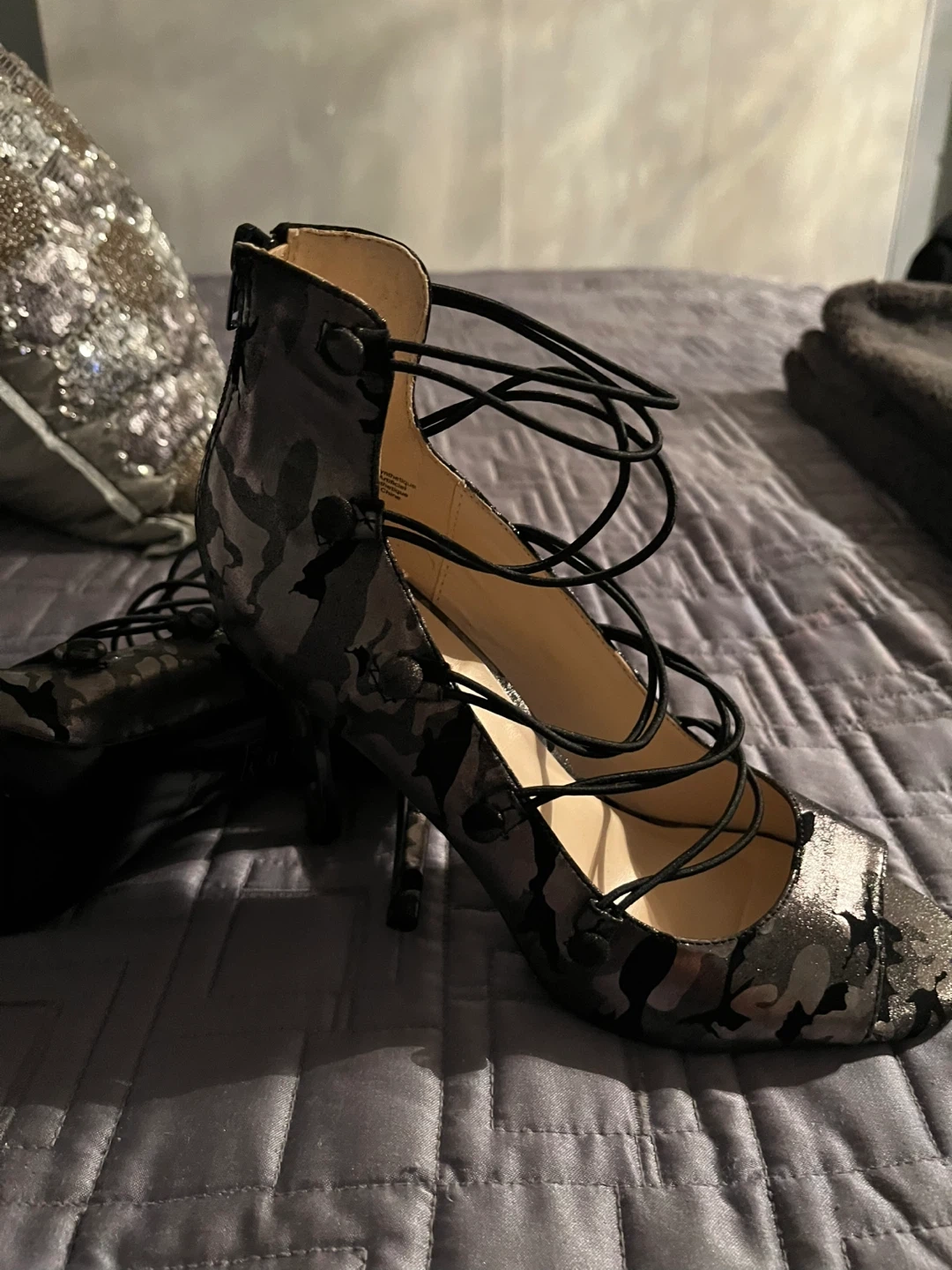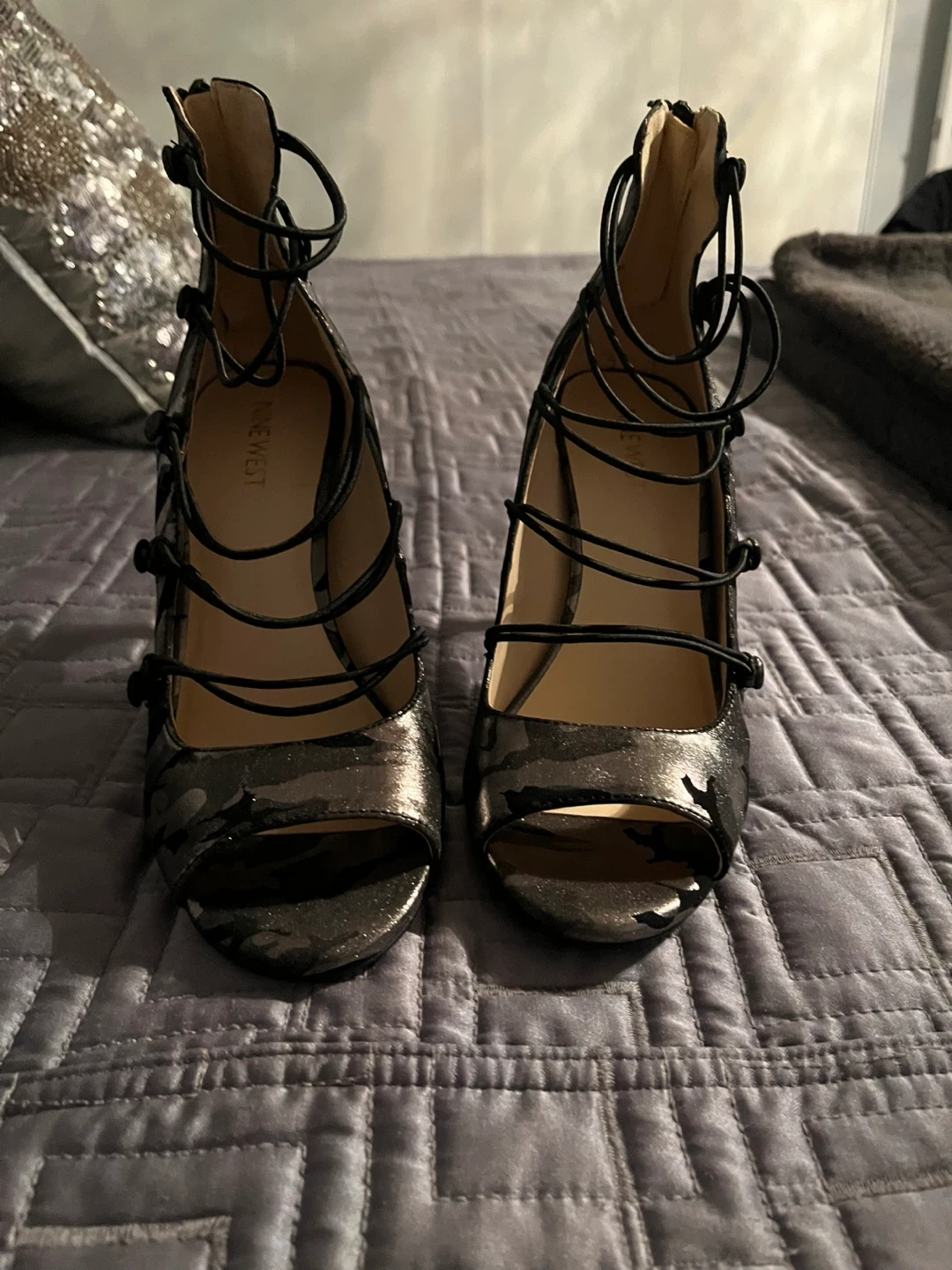 These Nine West heels are a unique addition to any closet! They have a lace-up design and a peep toe. They are size 8.5 qnd are brand new never worn Super sexy wear with jeans or dress them up !