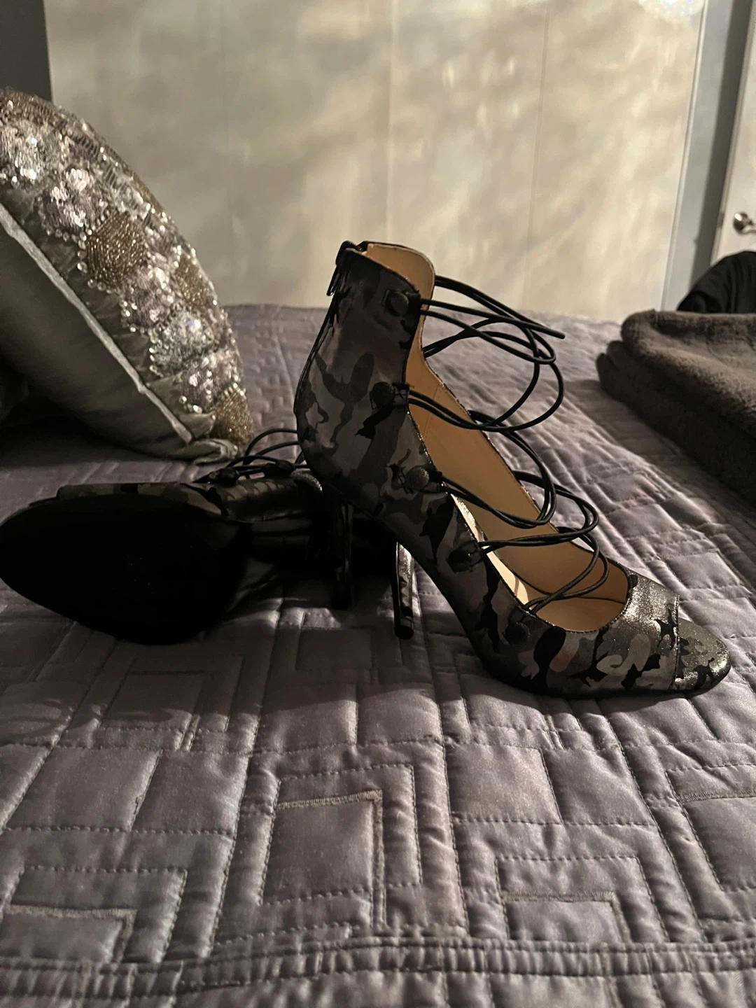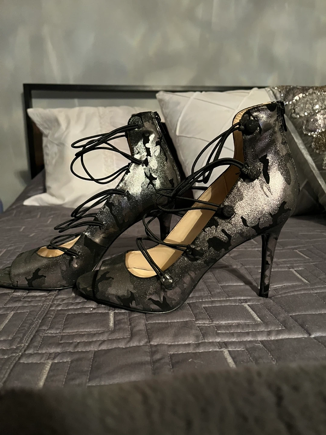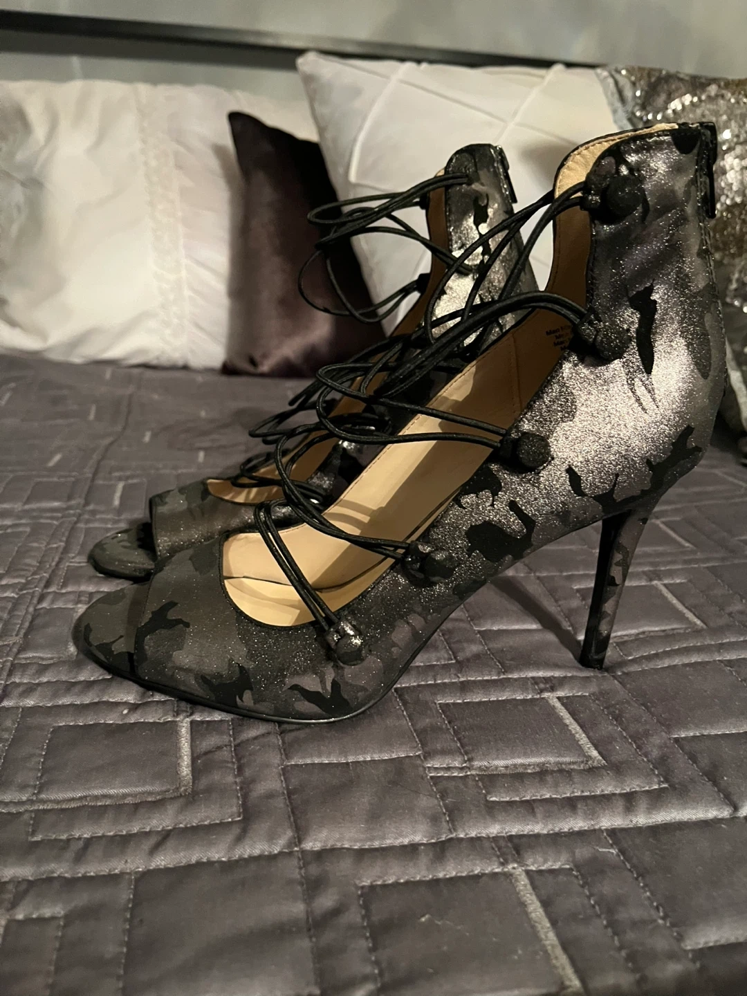 These Nine West heels are a unique addition to any closet! They have a lace-up design and a peep toe. They are size 8.5 qnd are brand new never worn Super sexy wear with jeans or dress them up !