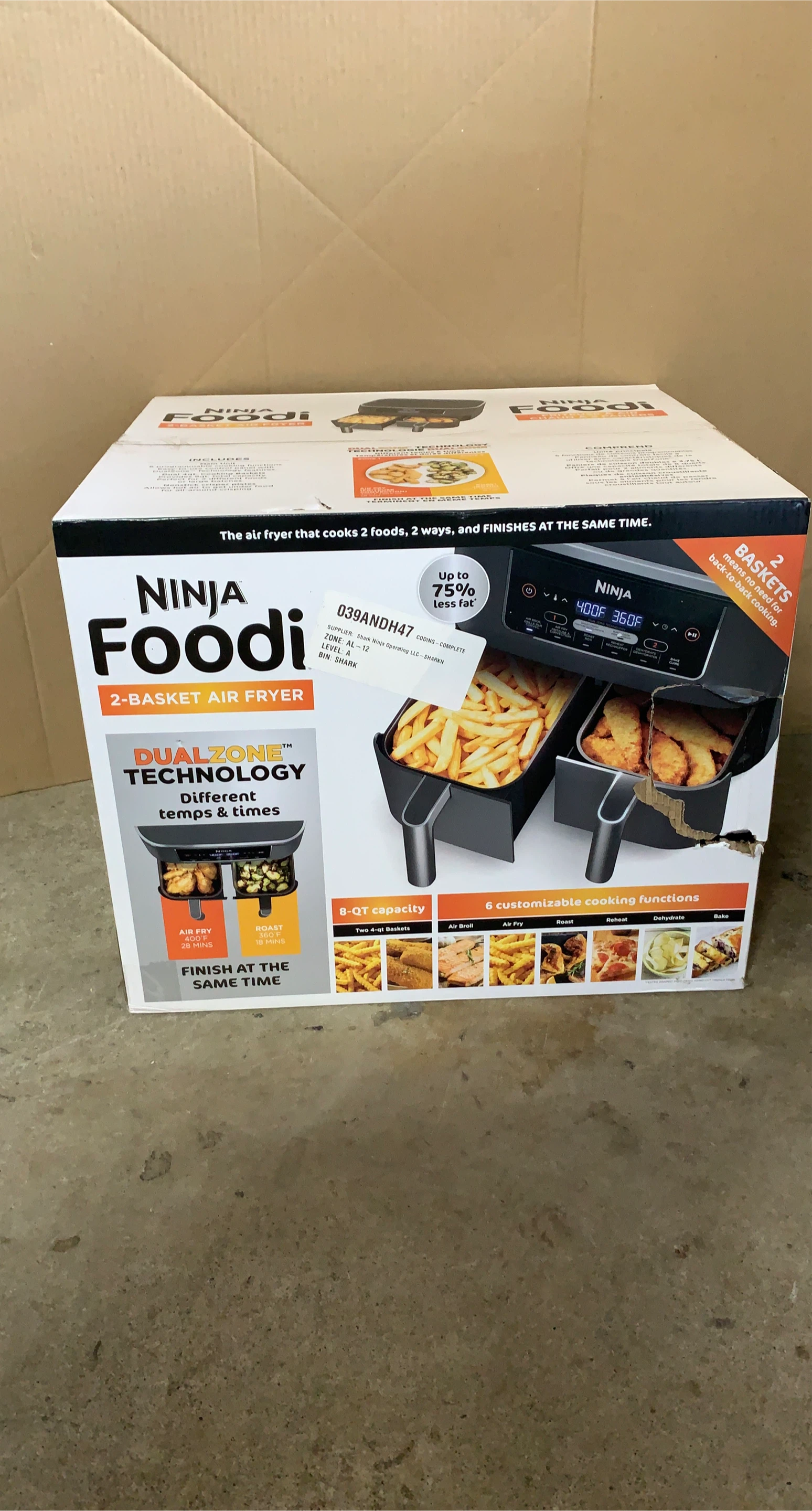 Selling a Ninja Foodi 2-Basket Air Fryer! It's an 8-QT capacity air fryer that cooks 2 foods, 2 ways, and finishes at the same time. It has DualZone technology, which allows for different temperatures and times. It also has 6 customizable cooking functions: Air Broil, Air Fry, Roast, Reheat, Dehydrate, and Bake