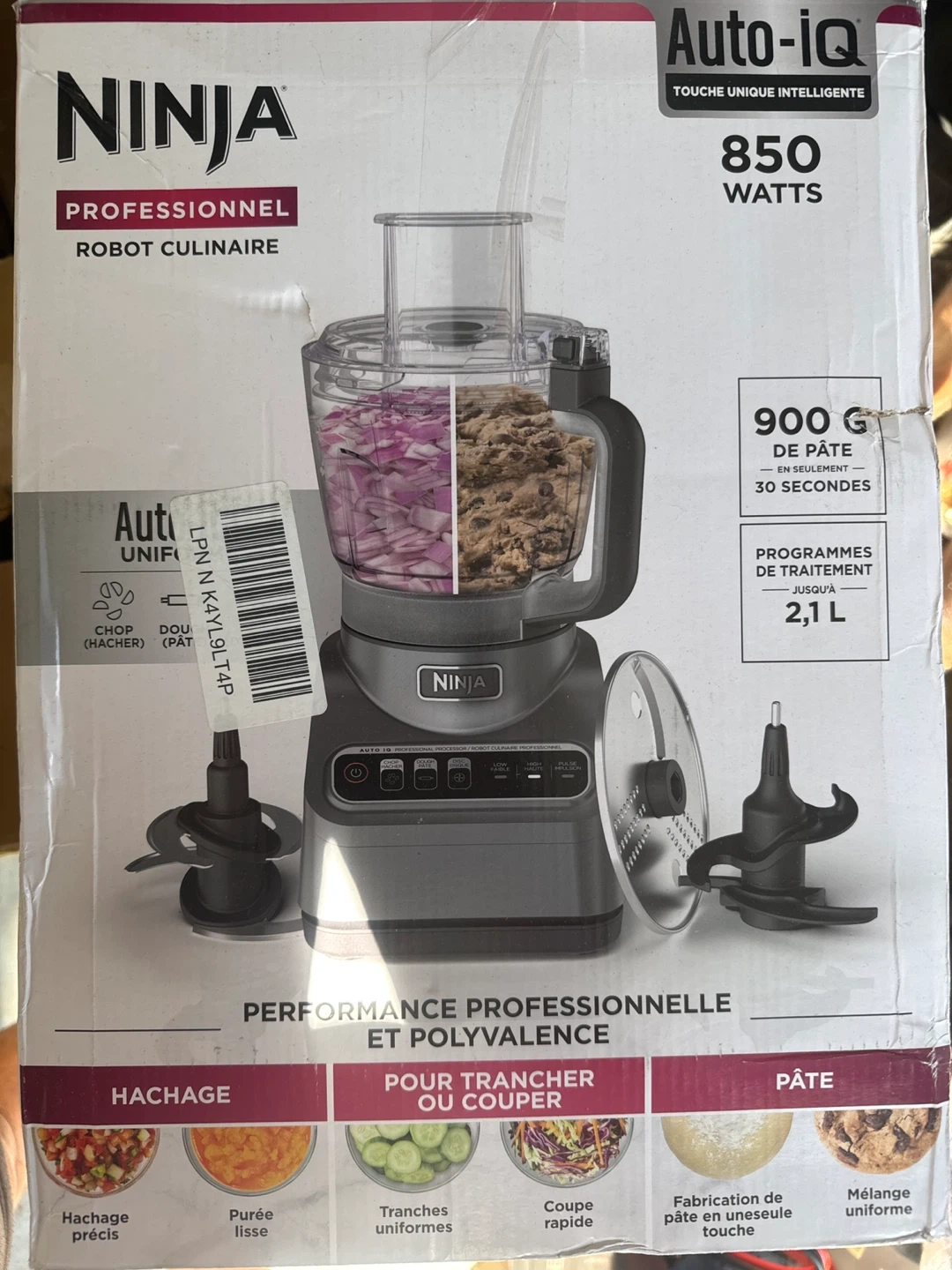 Selling a Ninja Professional Food Processor with Auto-iQ. This robot culinaire has an 850 watts motor and can handle up to 900g of dough in just 30 seconds. It has programs for chopping, dough, and slicing/shredding. It can hold up to 2.1L. It's perfect for all your food processing needs!