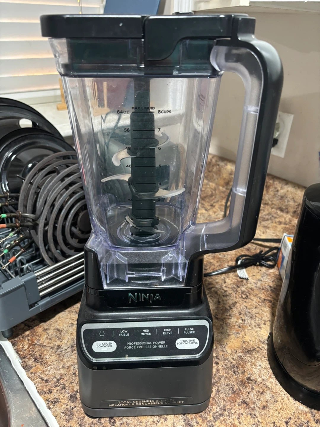 I'm selling a Ninja Professional Power Blender. It's in great condition and ready to make your favorite smoothies and crushed ice drinks. The blender has different power settings, including low, medium, high, and pulse. The container can hold up to 64oz of liquid or 8 cups. Perfect for making drinks for the whole family!