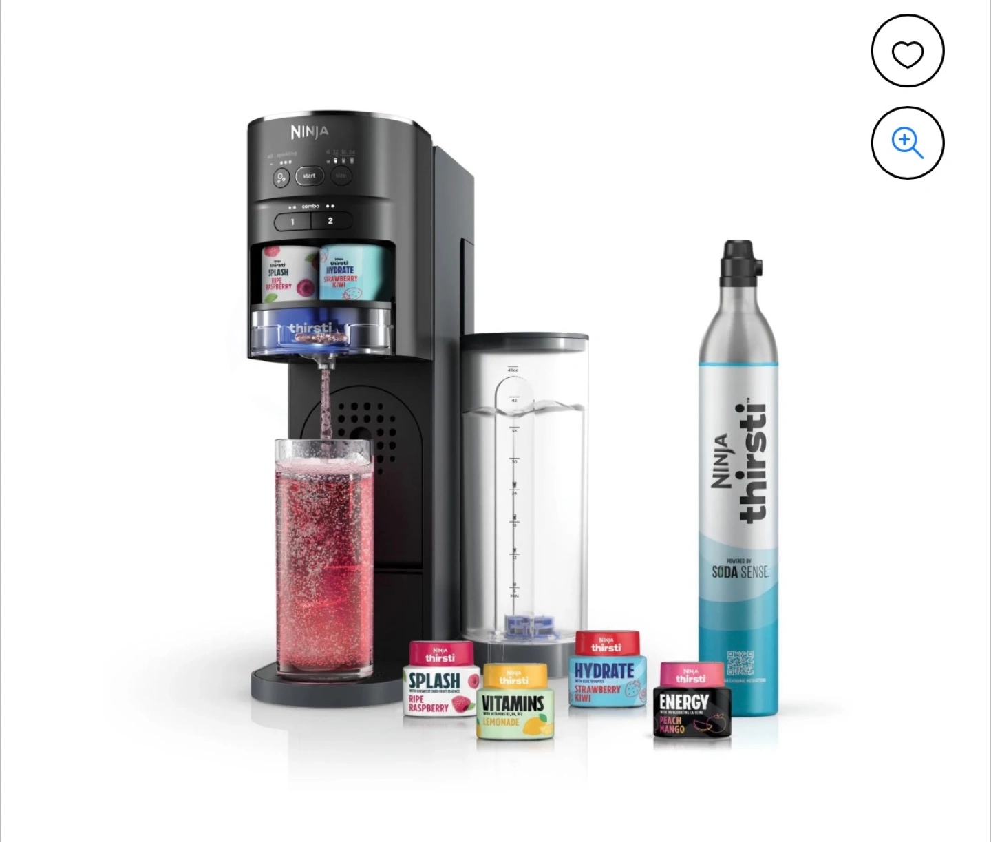 Ninja-branded soda maker. Makes carbonated water. Includes flavour pods. Creates sparkling water and flavoured drinks. Easy to use.