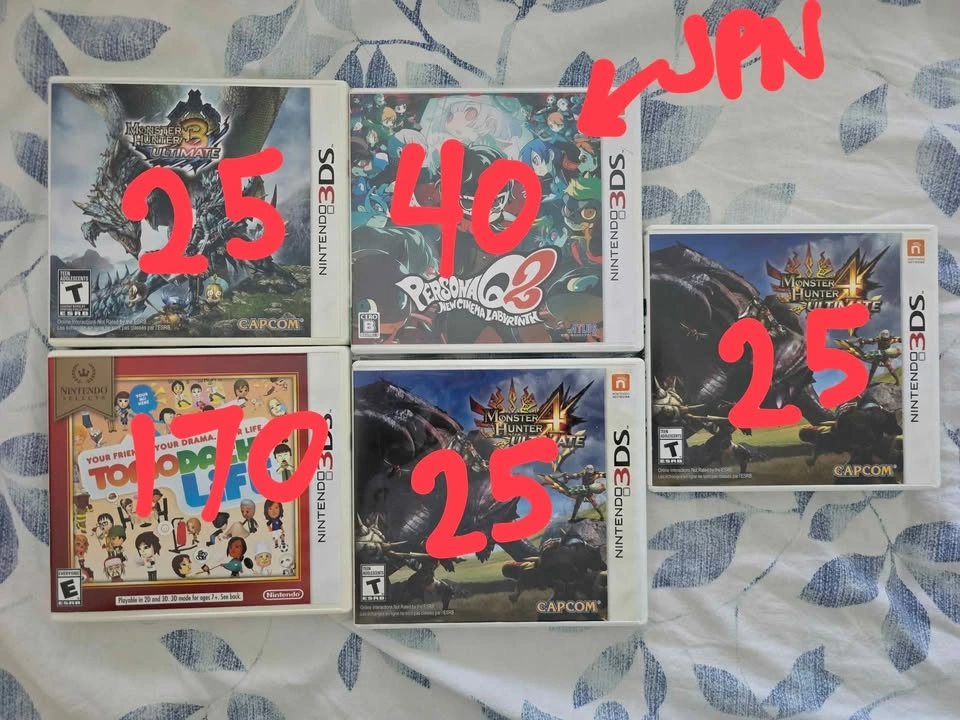 All complete in box. Persona Q2 is Japanese version (no english language and will not work on North American 3DS) Monster Hunter 3 sold. One Monster Hunter 4 remaining. Offers are welcome. Pick up in Langley or Poco.