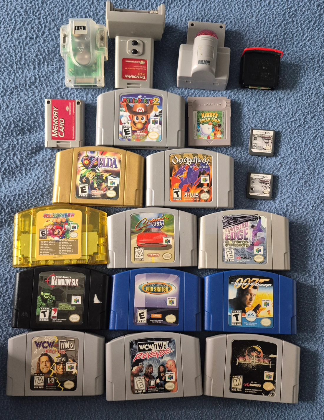 Excellent condition Like new (read descriptions and prices are firm) Nintendo ds games Transformer : War of Cybertron autobots $10 each Gameboy: Kirby Dream Land $15 Nintendo 64 games & accessories: Tremor pak plus $20 Rumble tremor vibration shock pak $20 NAKI NINTENDO 64 rumble pak $15 Nintendo 64 memory cards $15 Nintendo 64 expansion pak $65 Games: Mario party 2 (reproduction) $30 Authentic games: Ogre Battle 64 : Person of lord caliber $175 Legend of zelda: Majora Mask collector edition $100 Mario party (3 in 1) $45 Twist edge: Extreme snowboarding $20 Tony hawk pro skater $20 007: The world is not enough $40 Mortal kombat 4 $40 Tom Clancy: Rainbow six $15 Cruis'n USA $15 Wcw vs Nwo: World tour $10 Wcw vs Nwo: Revenge $10