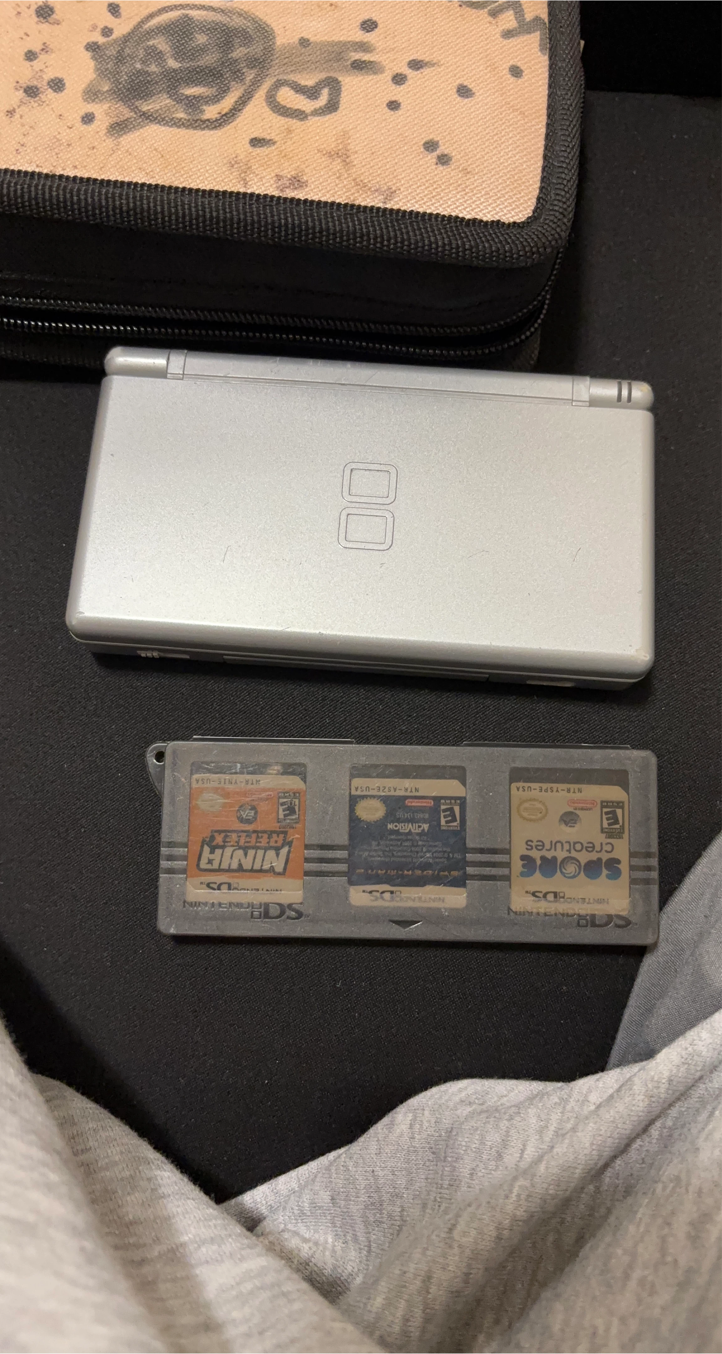 Selling a used Nintendo DS Lite in silver, along with a few games: Ninja Reflex, Spore Creatures, and Activision's Spider-Man 2. Great for some retro gaming fun!