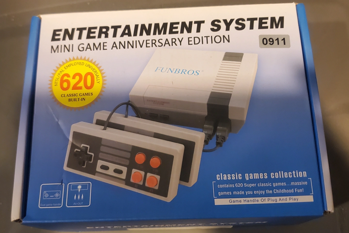 Mini retro Nintendo gaming console. 620 classic games built-in. Includes two controllers. Plug and play. Play all your classic Nintendo games.