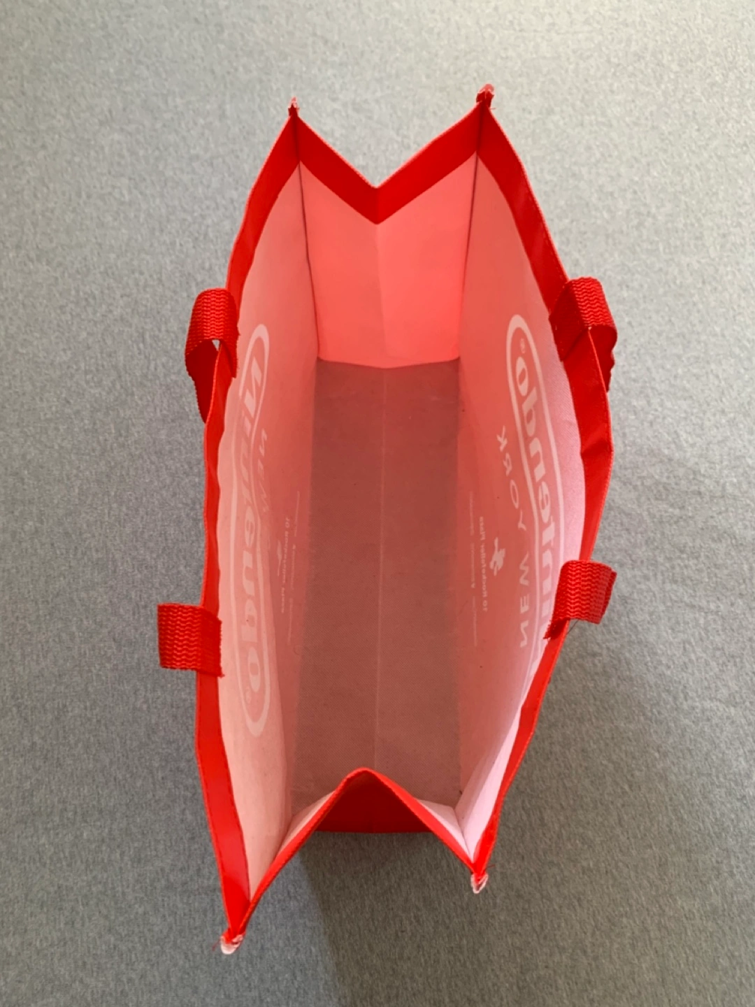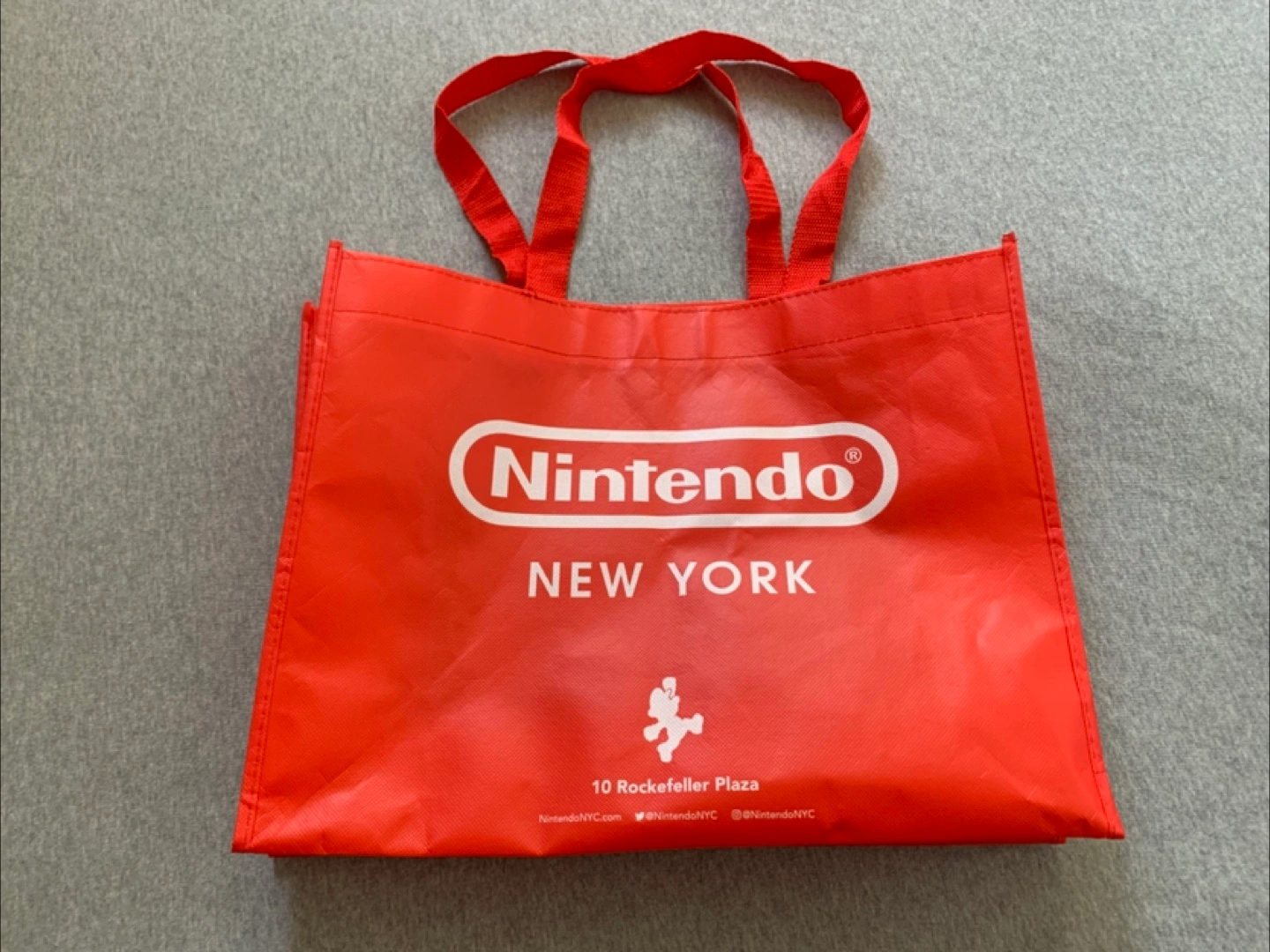 Reusable shopping bag. Red with white Nintendo logo. New York Rockefeller Plaza location details printed.