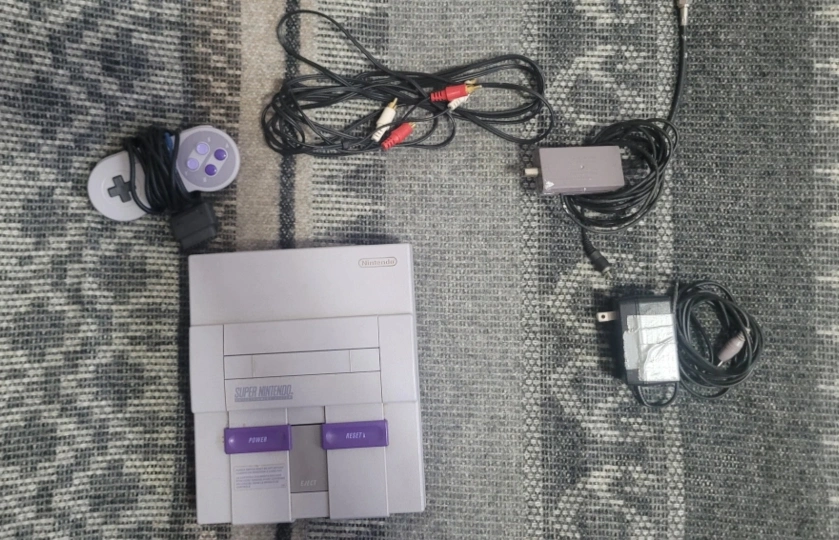 Selling a Super Nintendo SNES console. It comes with a controller, power adapter, and AV cables. Ready for some retro gaming!