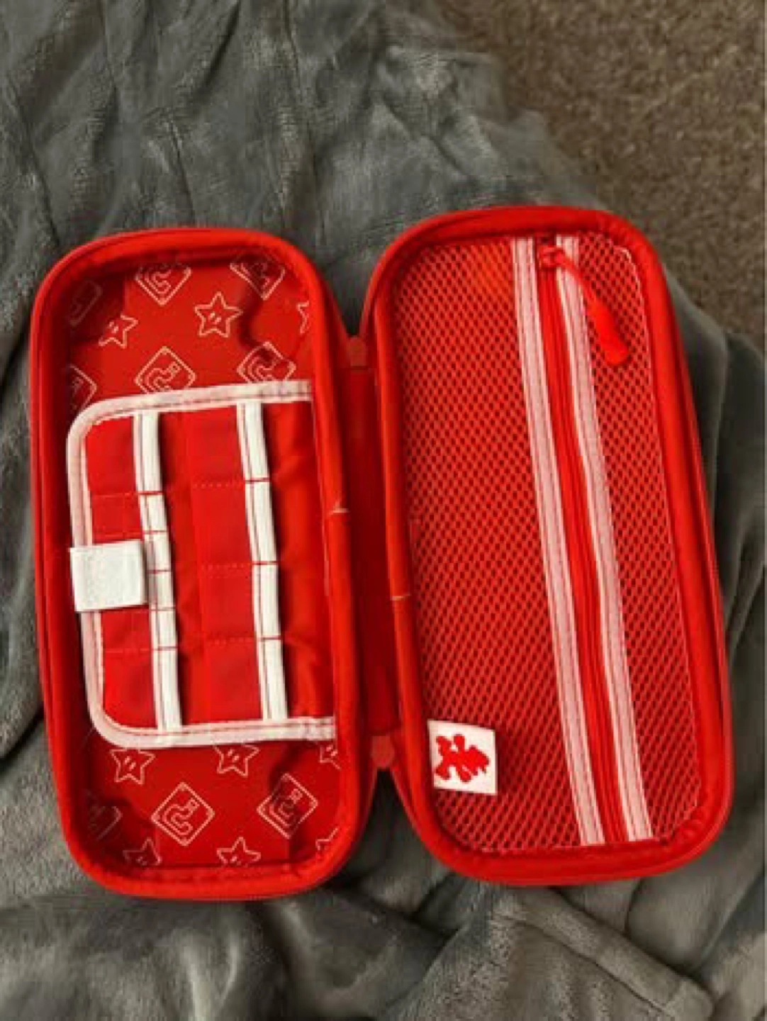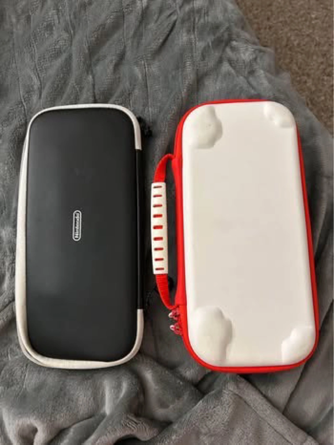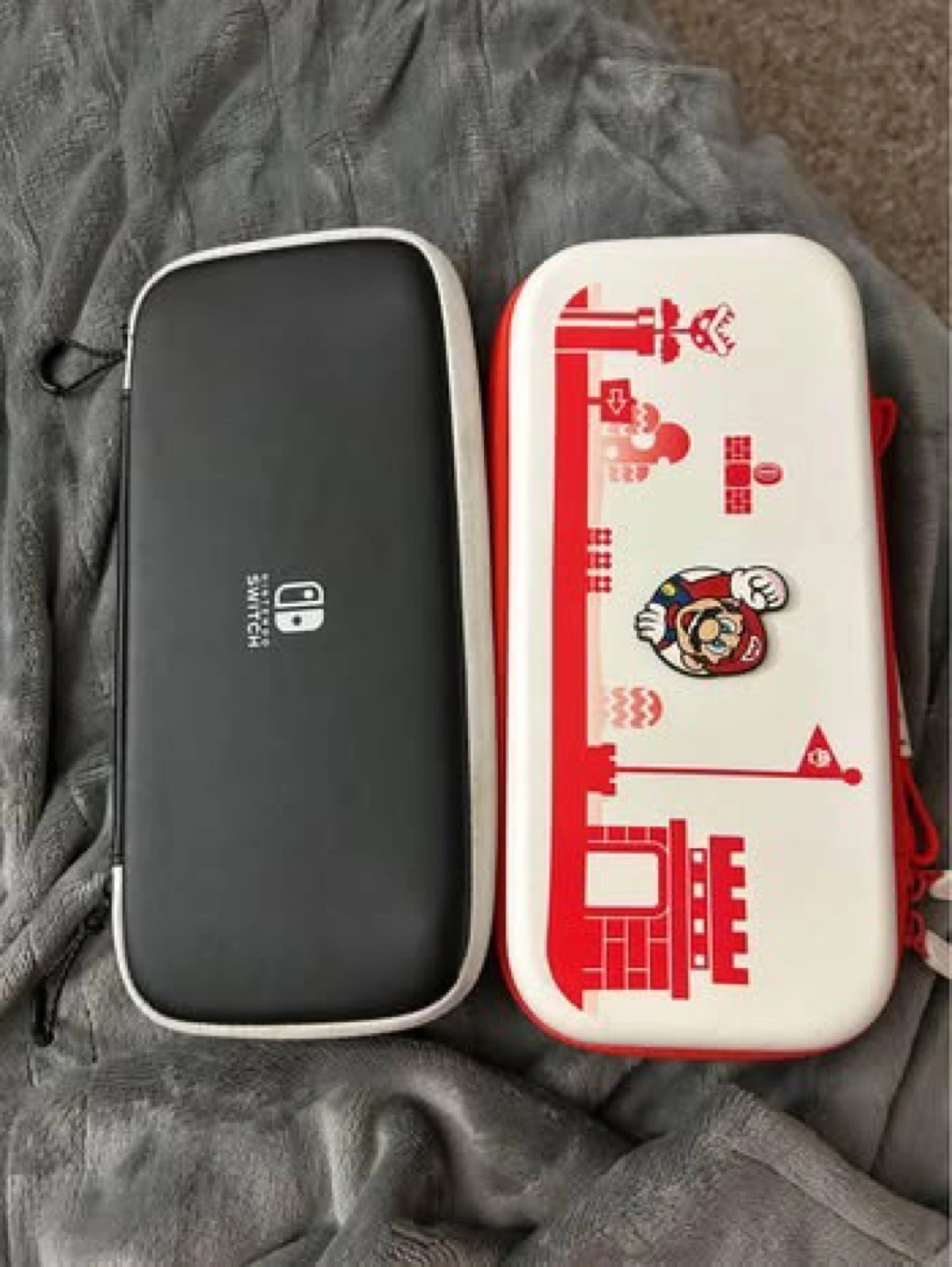 Two Nintendo Switch carrying cases. Two hard shell cases, one black and white, one red and white with Mario theme with internal pockets. Good condition.
