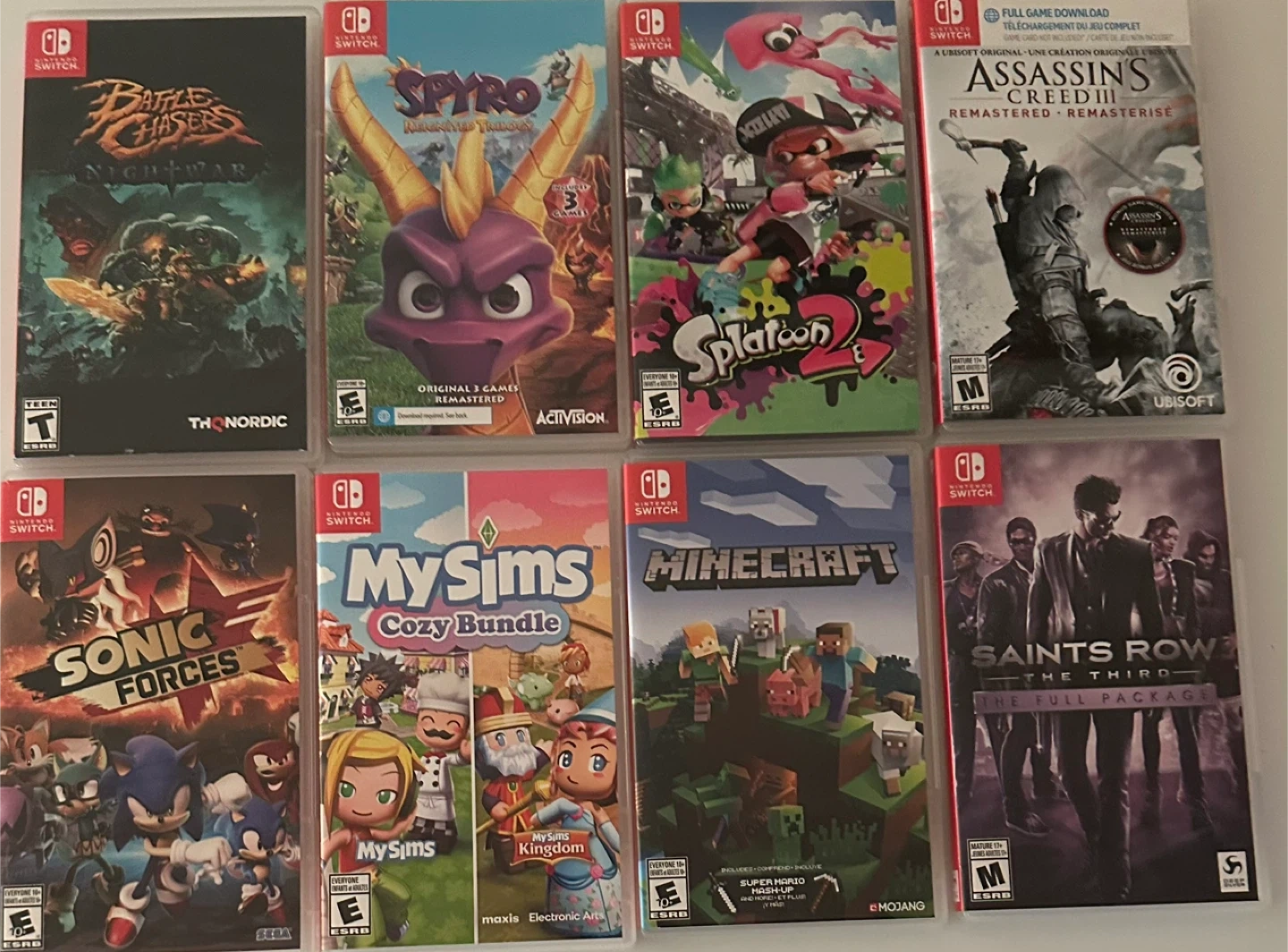 Selling a collection of Nintendo Switch games! Includes: - Battle Chasers Nightwar - Spyro Reignited Trilogy - Splatoon 2 - Assassin's Creed III Remastered - Sonic Forces - MySims Cozy Bundle - Minecraft - Saints Row The Third: The Full Package Message for pricing