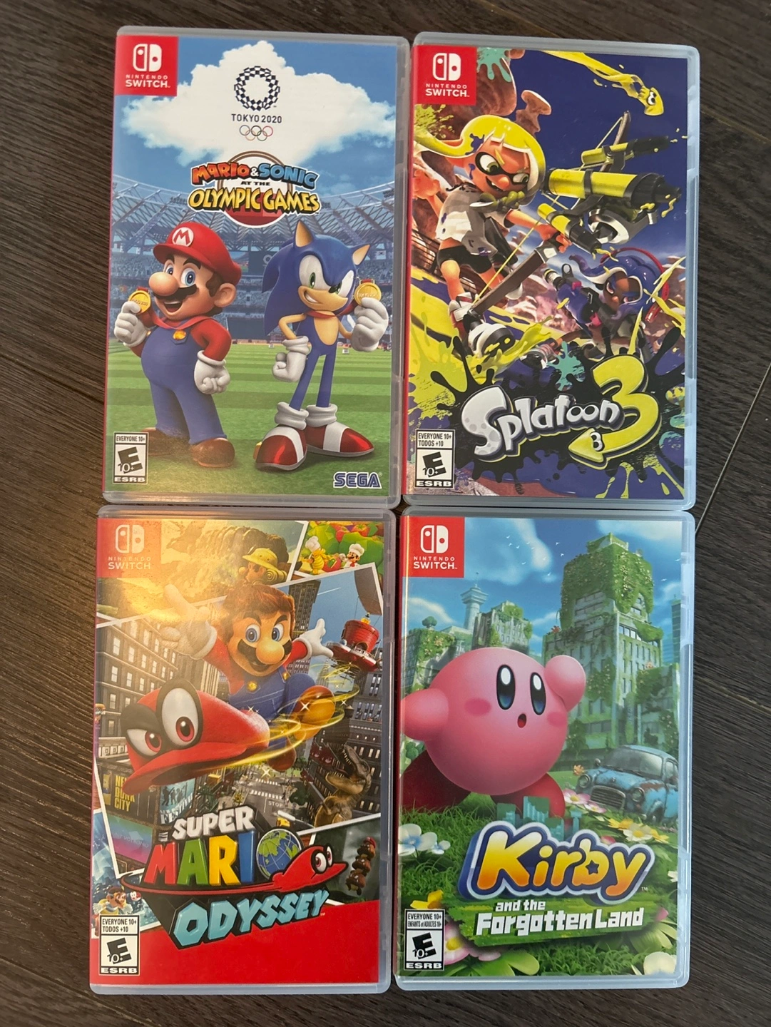 Bundle of 4 Nintendo Switch video games. Games include Mario & Sonic at the Olympic Games, Splatoon 3, Super Mario Odyssey and Kirby and the Forgotten Land. 40 each.