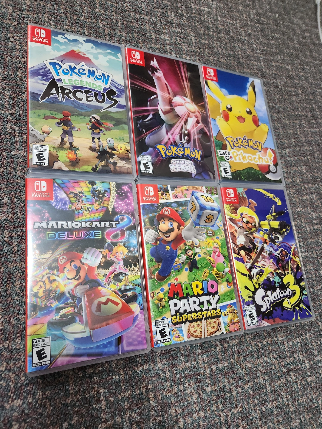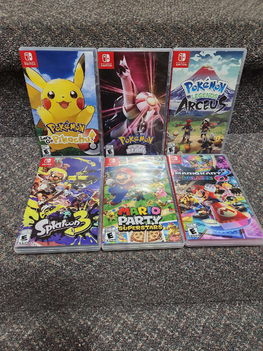 Selling a collection of Nintendo Switch games! Includes: - Pokemon Legends Arceus - Pokemon Shield - Let's Go Pikachu - Mario Kart 8 Deluxe - Mario Party Superstars - Splatoon 2 All games are in great condition and ready for a new home $75 each Game Selling for Someone
