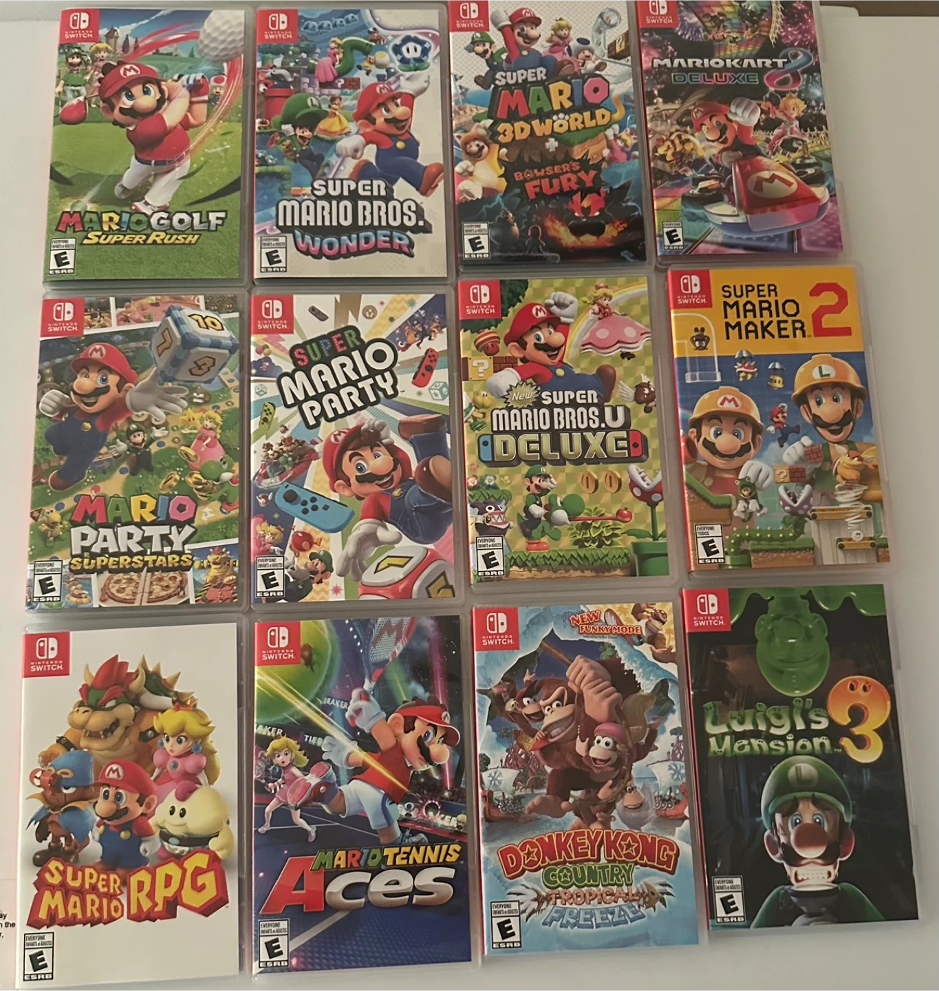 Selling a bunch of Nintendo Switch games! Titles include: - Mario Golf Super Rush - Super Mario Bros Wonder - Super Mario 3D World + Bowser's Fury - Mario Kart Deluxe - Mario Party Superstars - Super Mario Party - New Super Mario Bros U Deluxe - Super Mario Maker 2 - Super Mario RPG - Mario Tennis Aces - Donkey Kong Country Tropical Freeze - Luigi's Mansion 3 All games are in great condition! Message for pricing