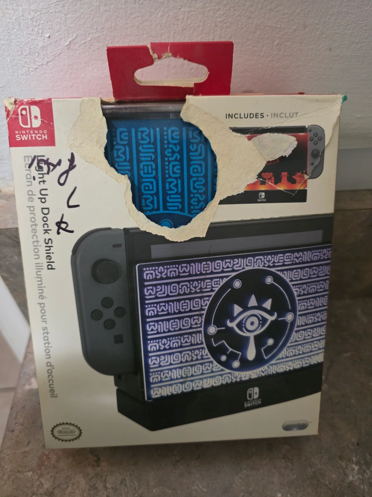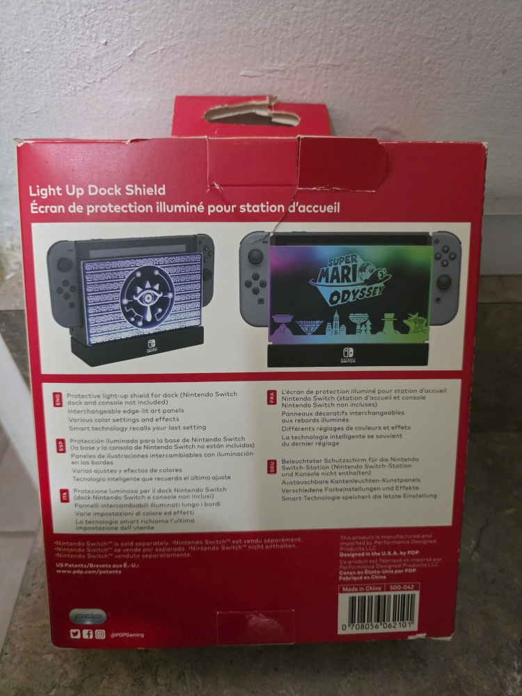 Selling a Nintendo Switch Light Up Dock Shield! It has protective light-up shield for dock with interchangeable edge-lit in panels. Smart technology recalls your last setting. Box included Box is Damaged