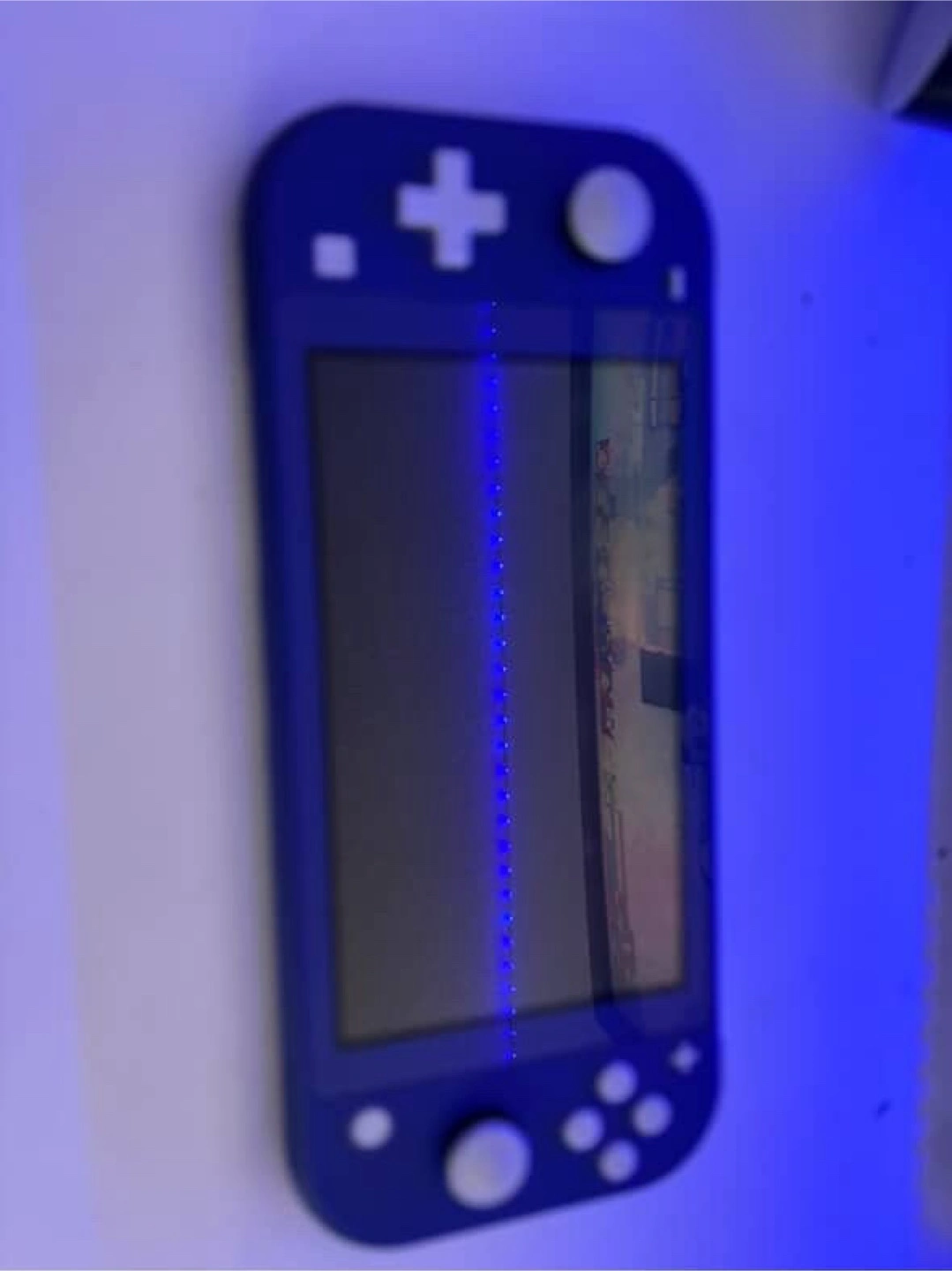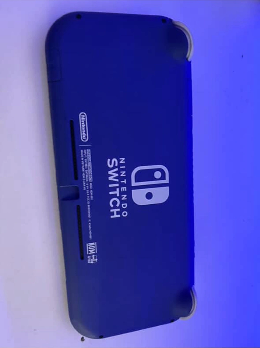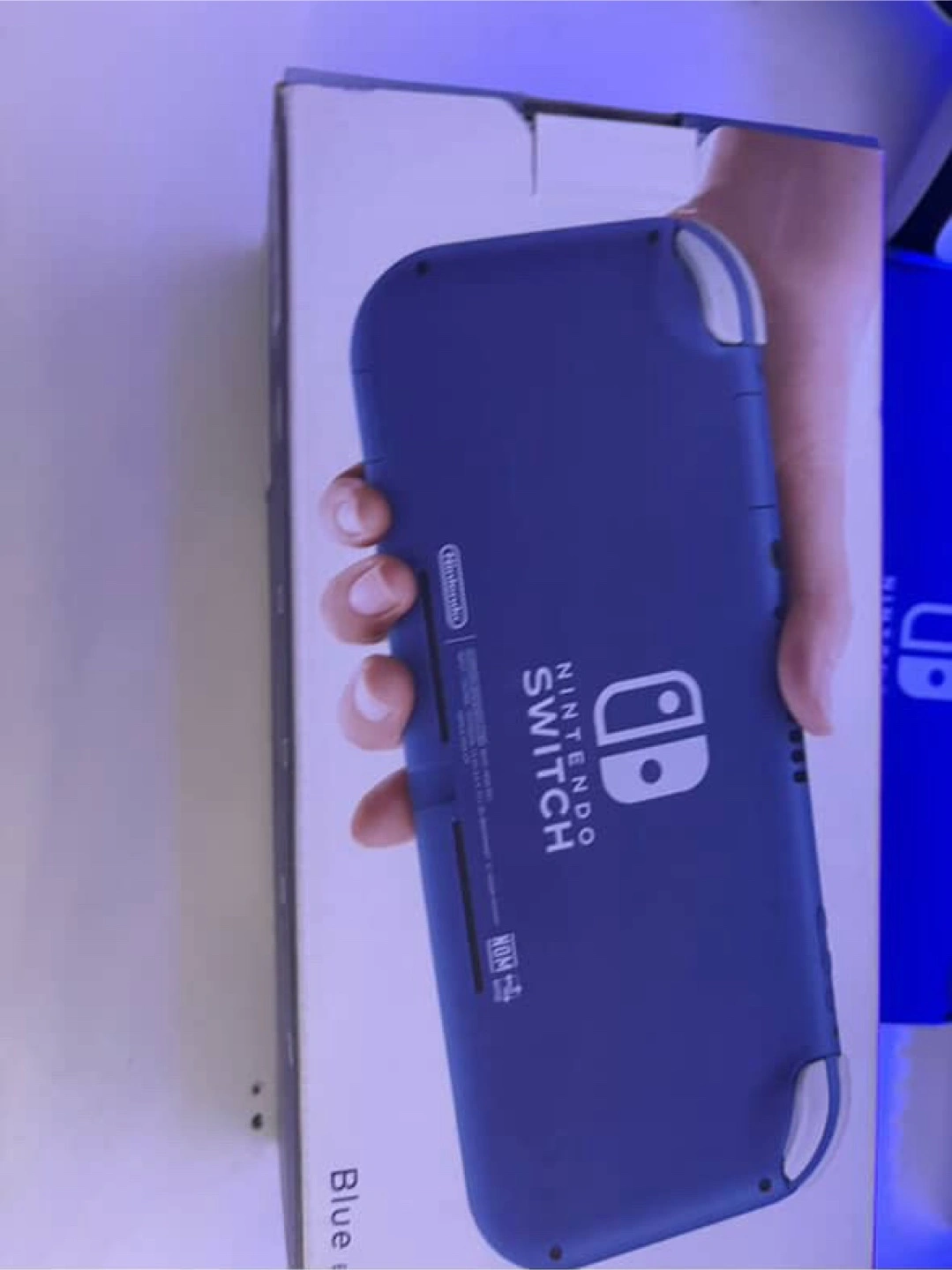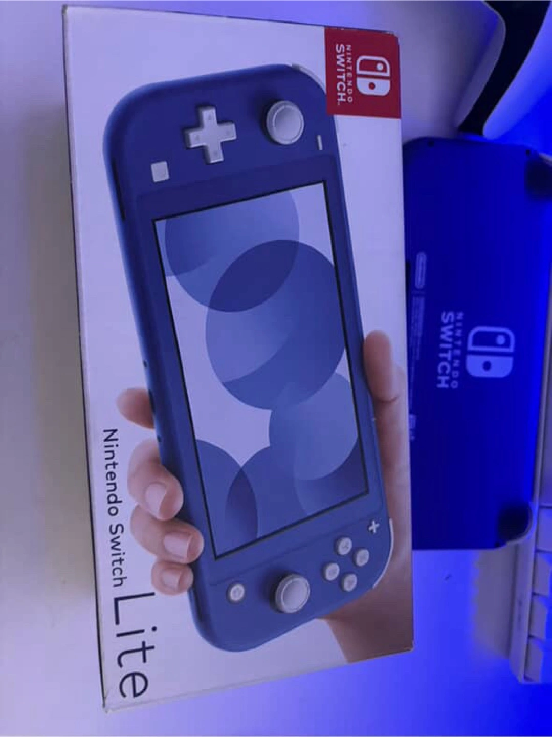 A Nintendo Switch Lite, blue in colour. Device with buttons and a screen. Comes with a box. You can easily enjoy this for hours on end after a long day.