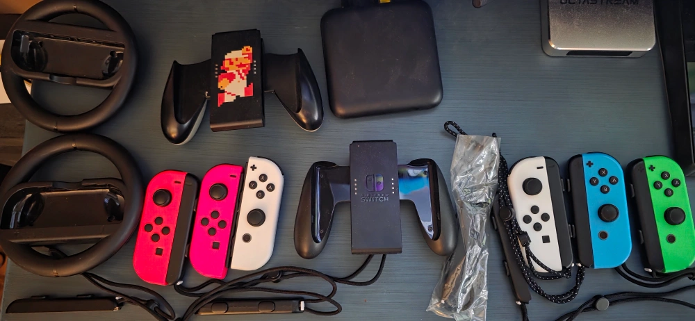 Selling a Nintendo Switch OLED with a variety of Joy-Cons in different colours (4 sets), two wheels and 2 remote holders! It comes with the dock and all the necessary cables. Original box. Great for family fun or gaming with friends. Games extra, inquire of them if you want games - sold separately.