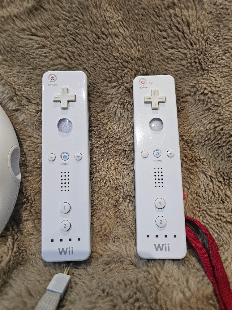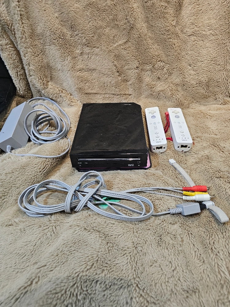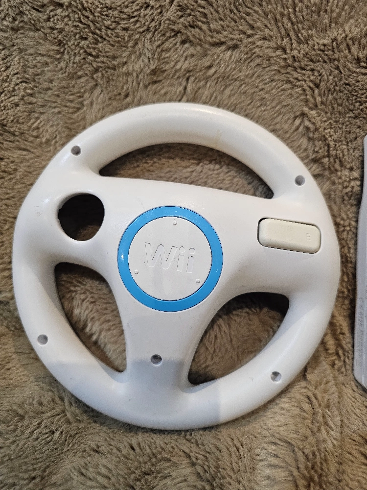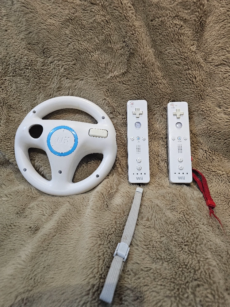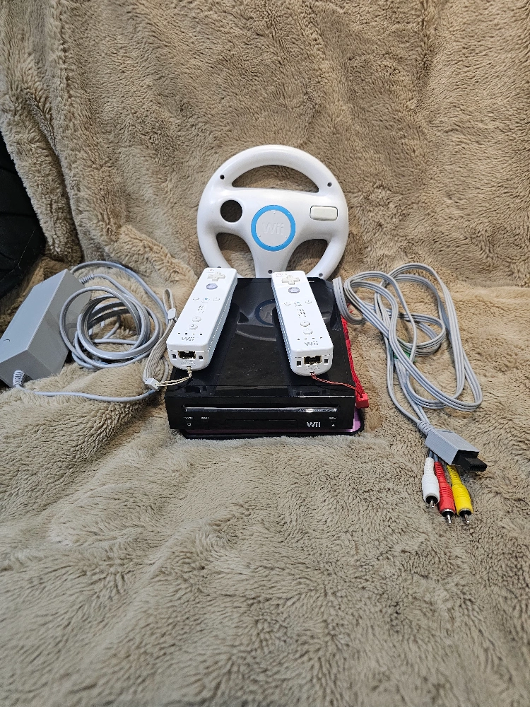 Selling a Nintendo Wii console. Includes two Wii remotes, a Wii wheel, power adapter, and AV cables. Great for some retro gaming fun!