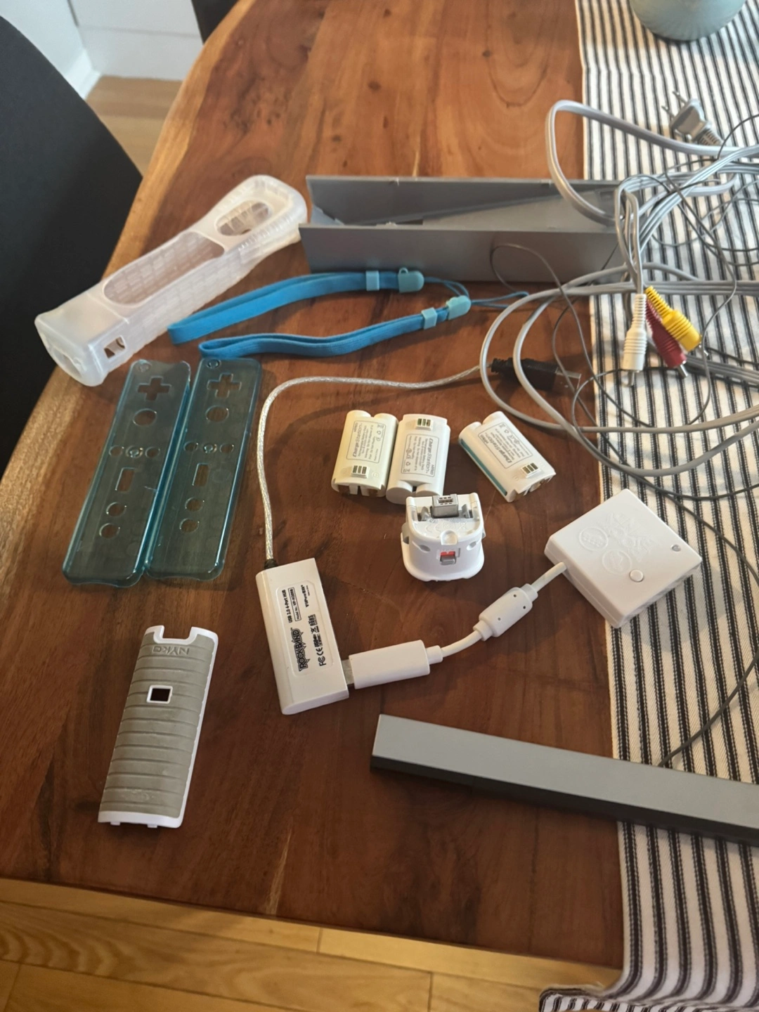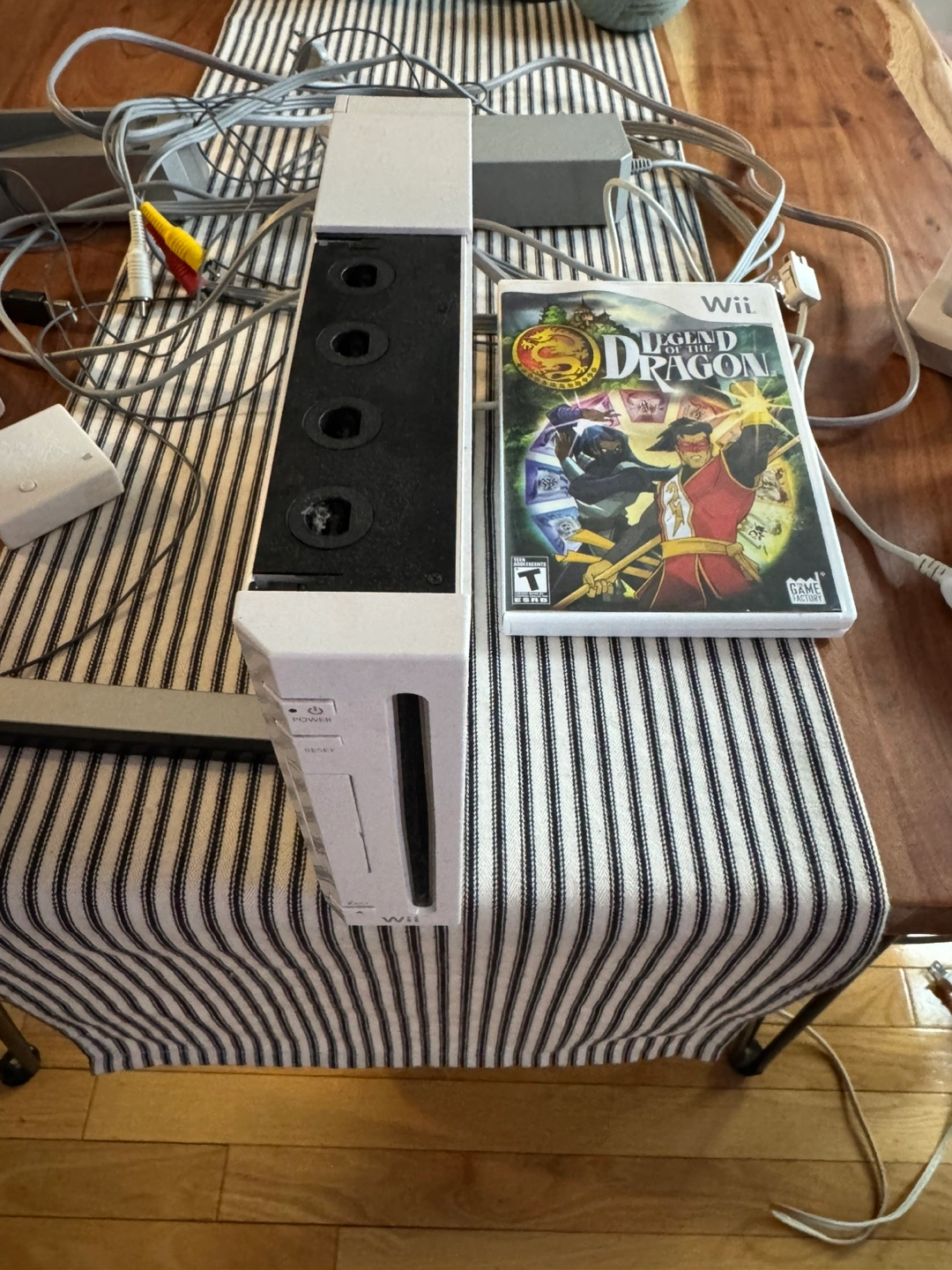 Pre-owned Nintendo Wii console. Includes console, , Nunchuk, sensor bar, power supply, AV cables, and charging stations. One game included: Legend of the Dragon with instructions booklet. Firm at $50