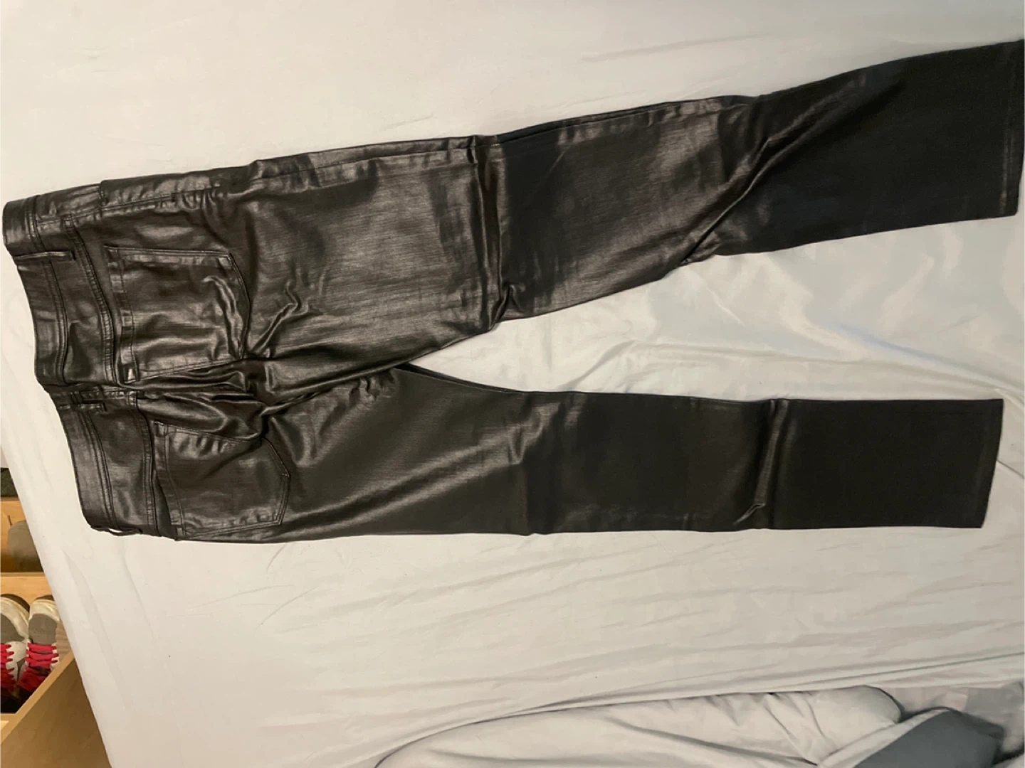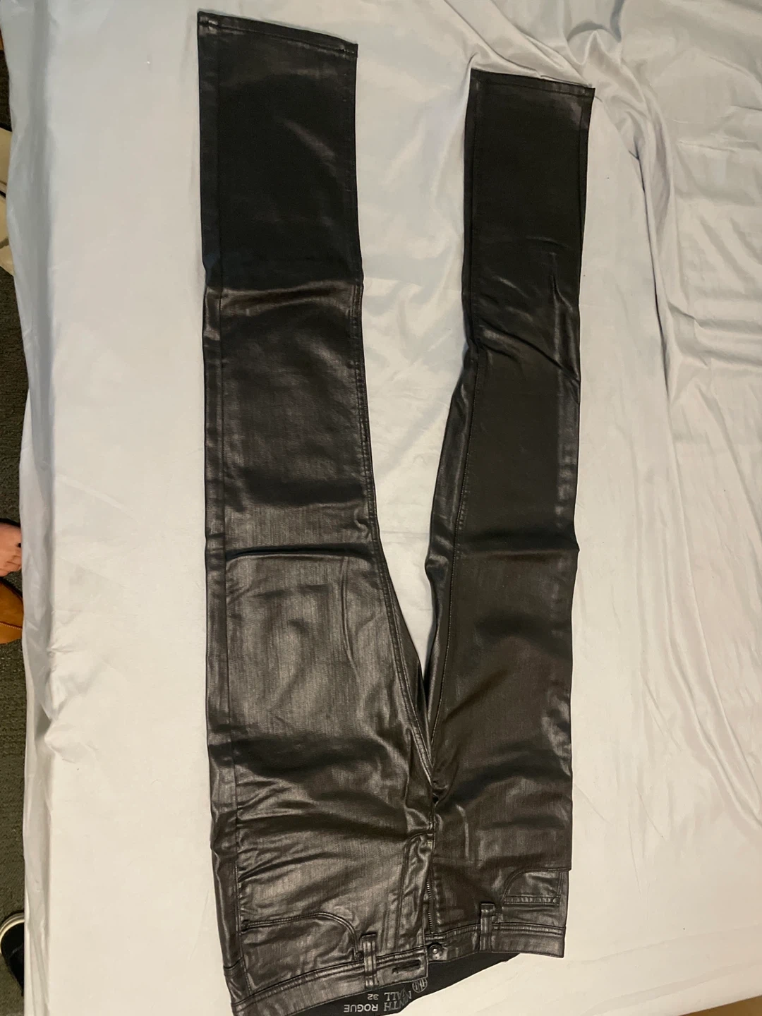 These are a pair of Ninth Hall Rogue waxed black denim jeans. I bought these Rick Owens inspired waxed denim Ninth Hall Rogue a while ago for my birthday but never used, they have just been folded up in a drawer. $40 OBO Pick up only