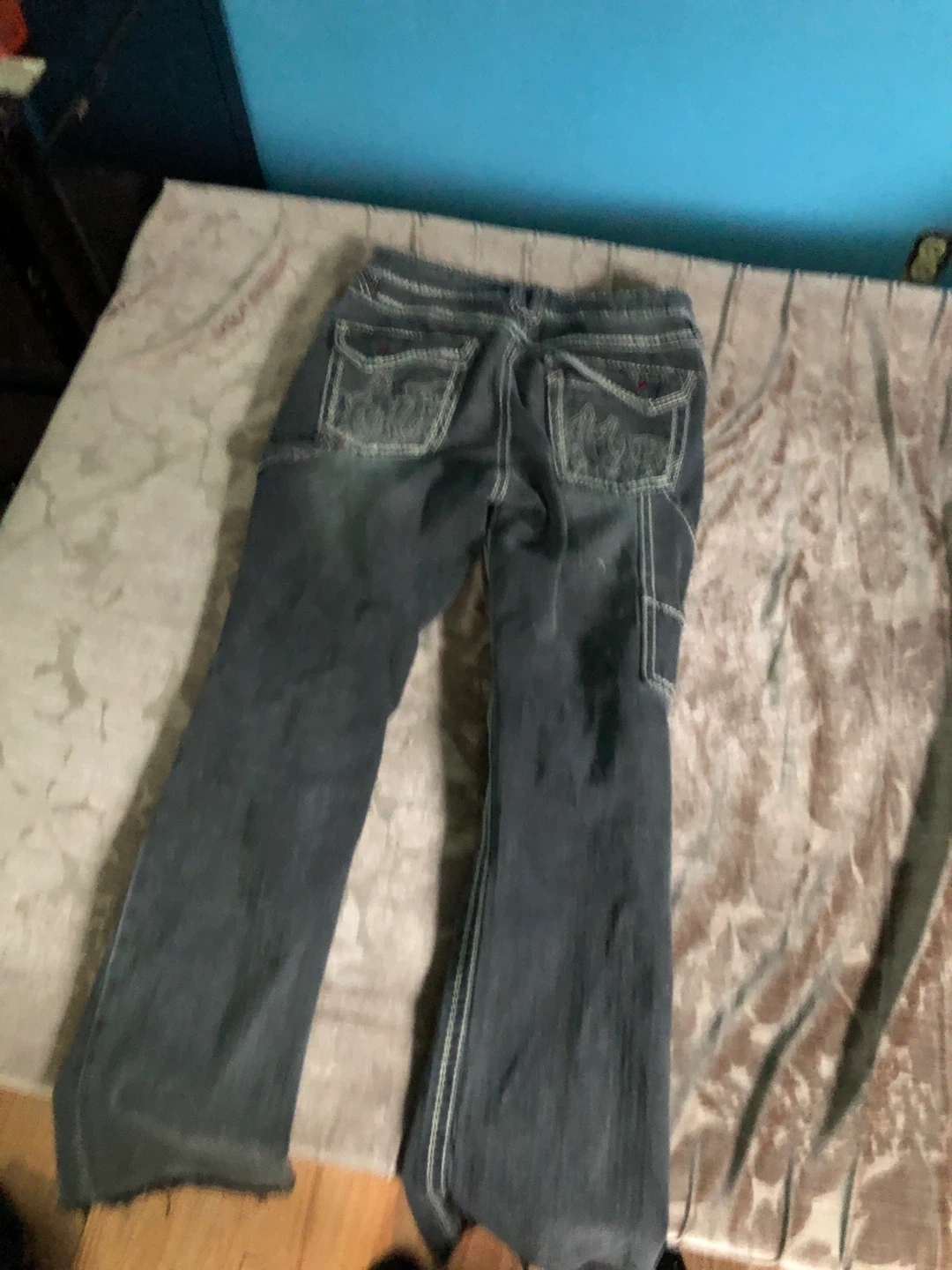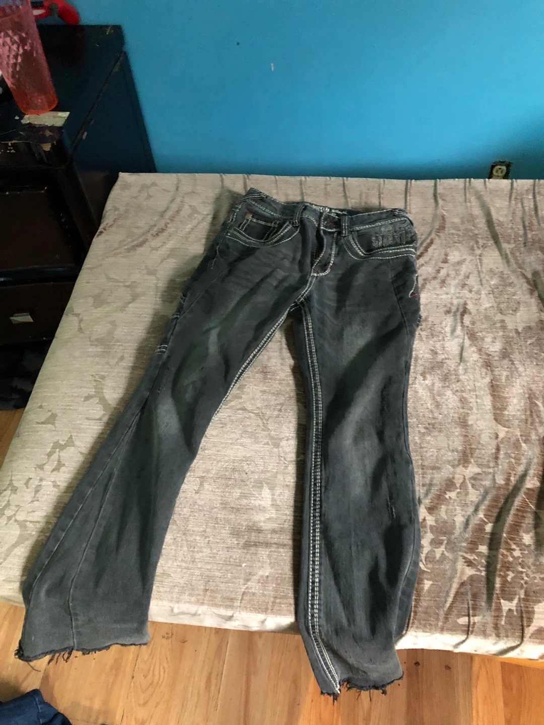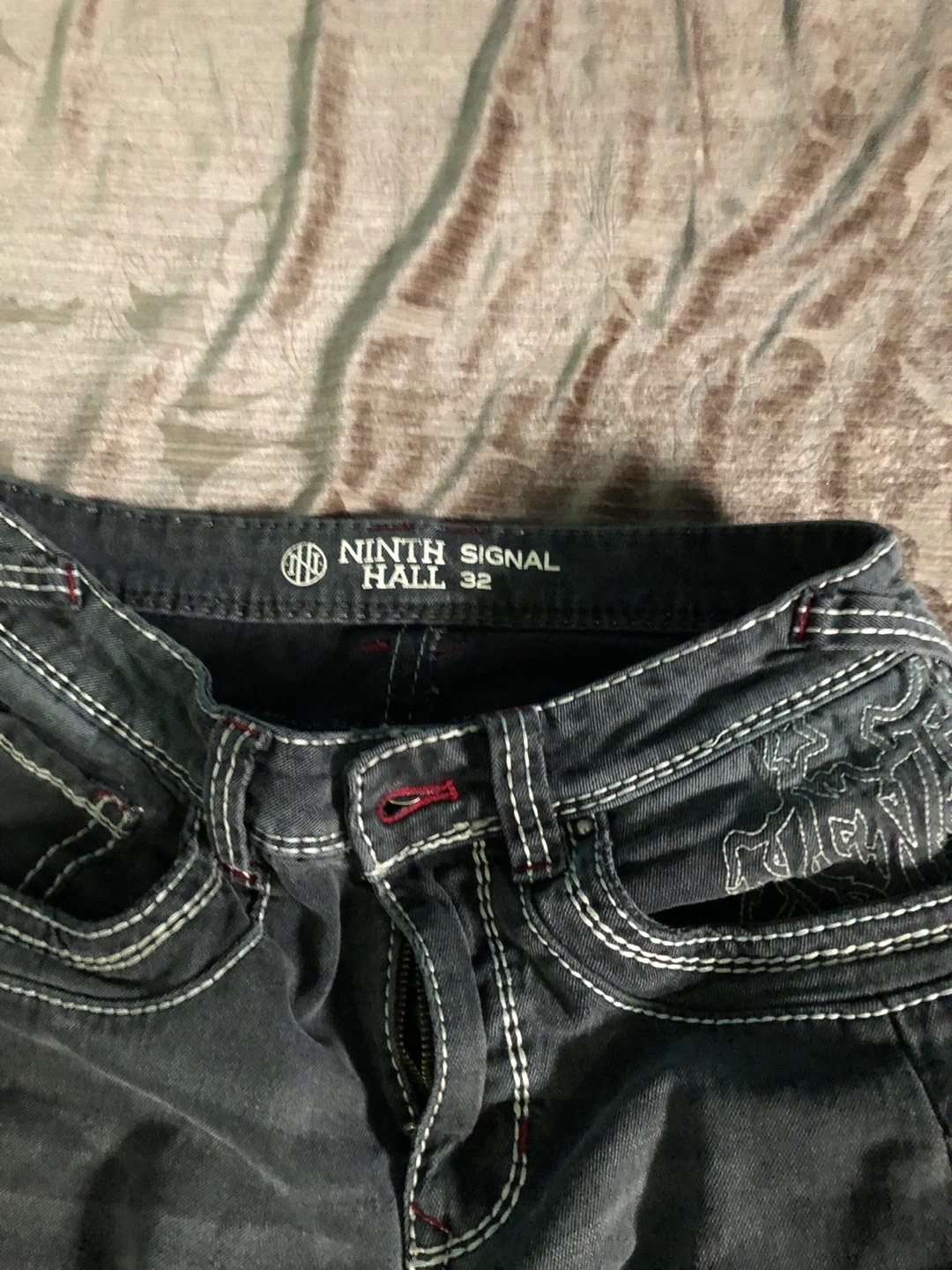 Selling a pair of Ninth Signal Hall jeans in size 32. They are in good condition and feature a unique design with white stitching. Perfect for casual wear!