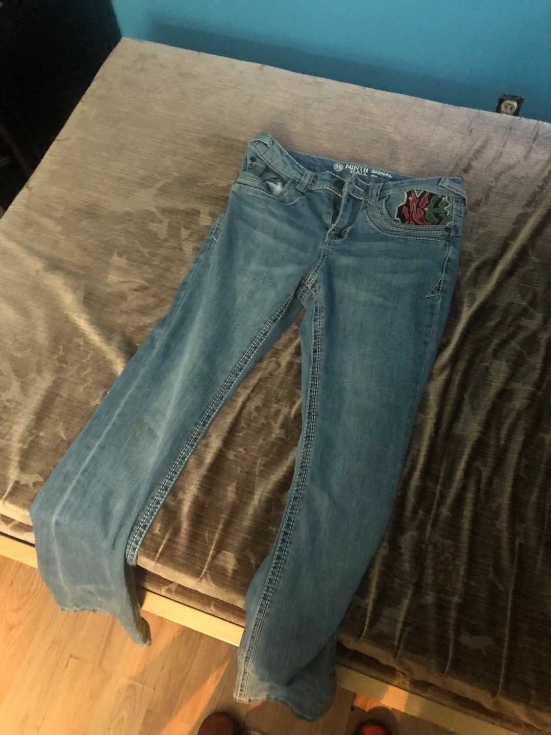 Selling a pair of Ninth Signal jeans in size 30. They're in good condition and have a unique design on the pockets. Perfect for everyday wear!