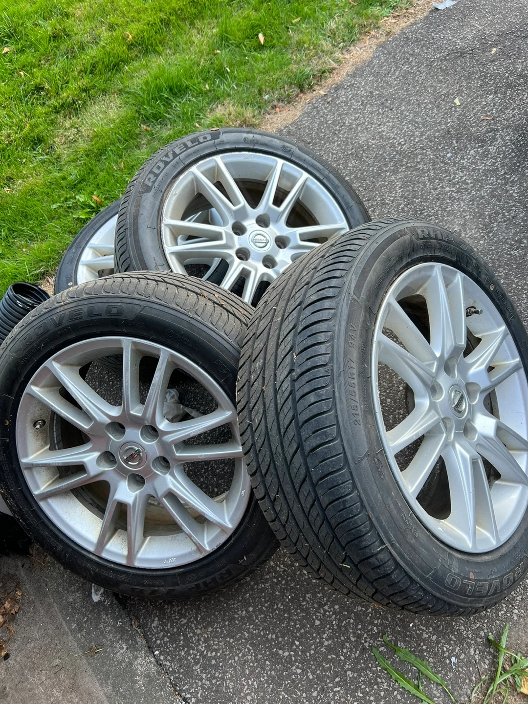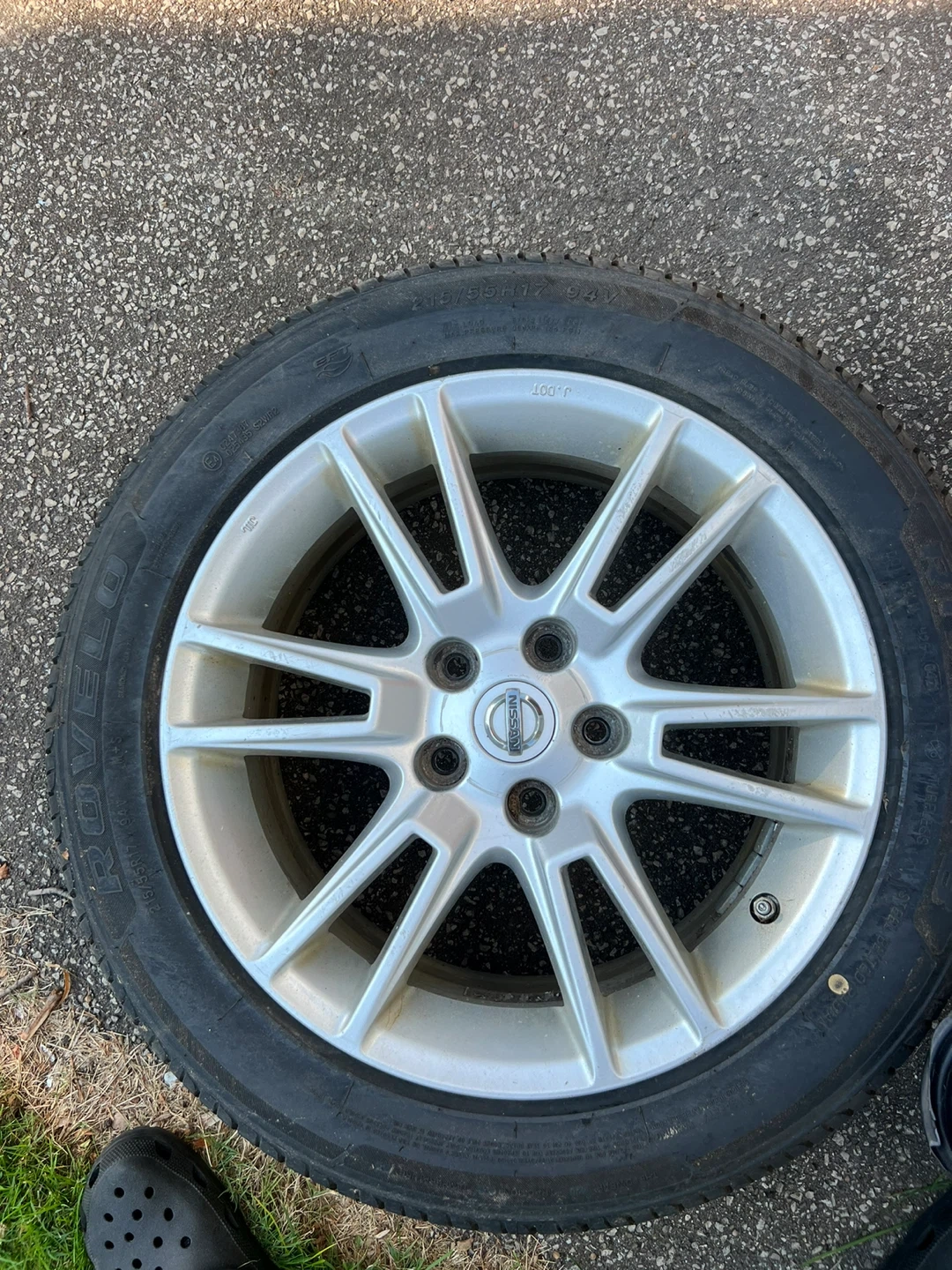 Selling a set of four Nissan tires and rims. The tires are Rovel RHP-77, size 215/55R17. They're in good condition and ready to be used!
