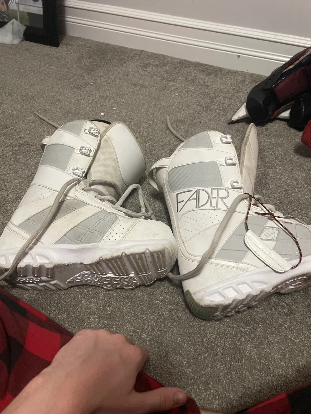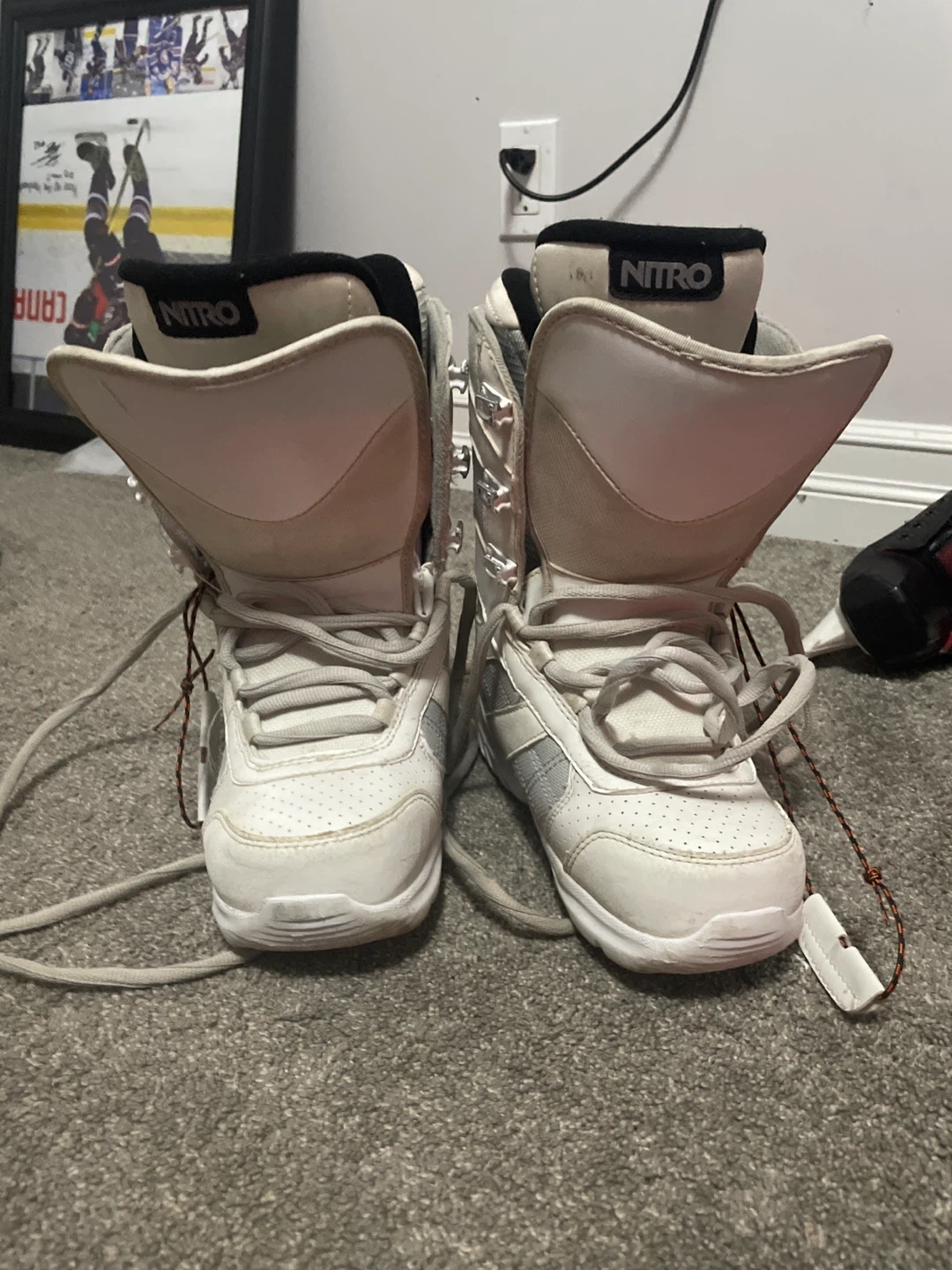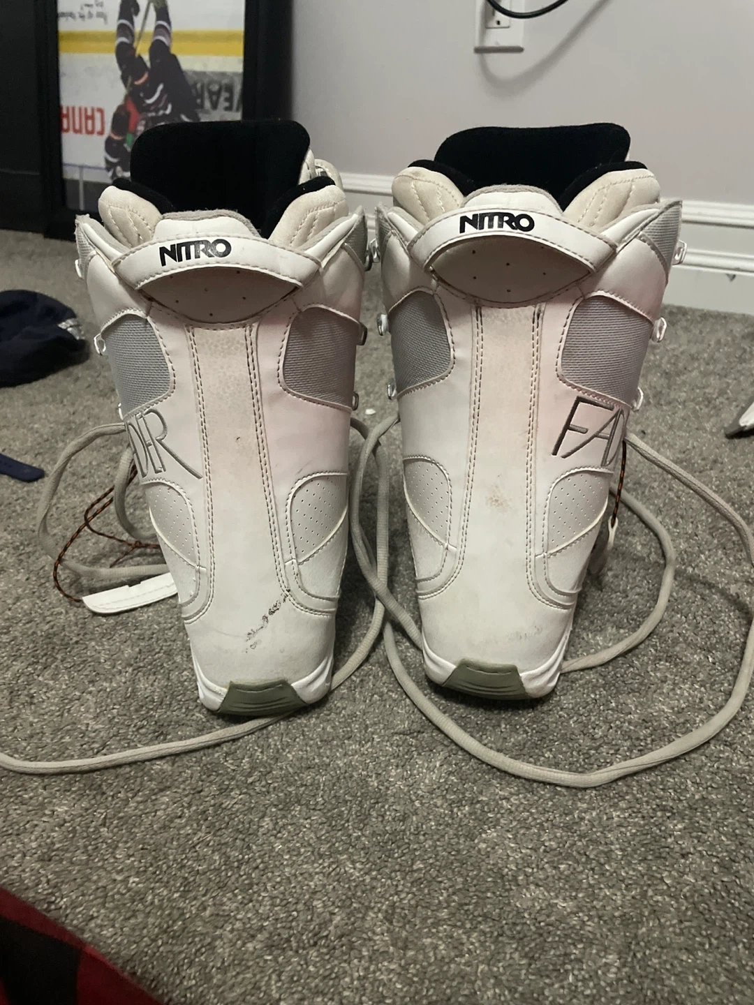 Selling a pair of Nitro Fader snowboard boots. They're white and have the Nitro logo on the back. They're in used condition, so please see the photos for details!