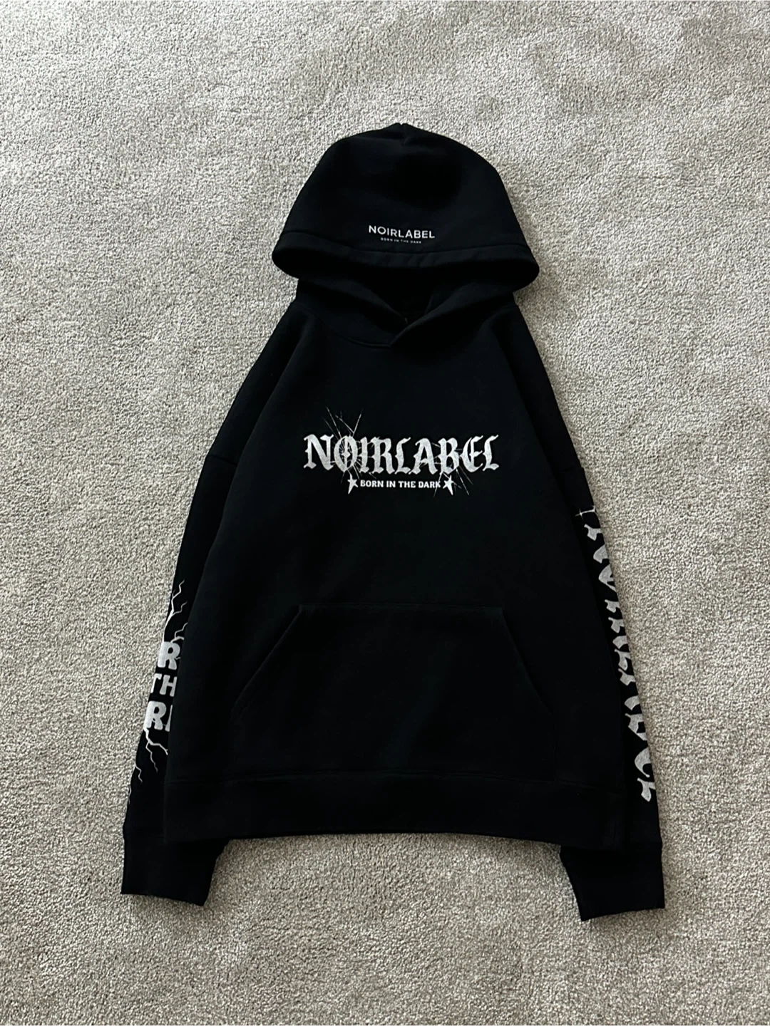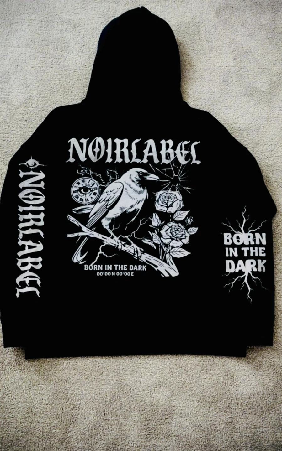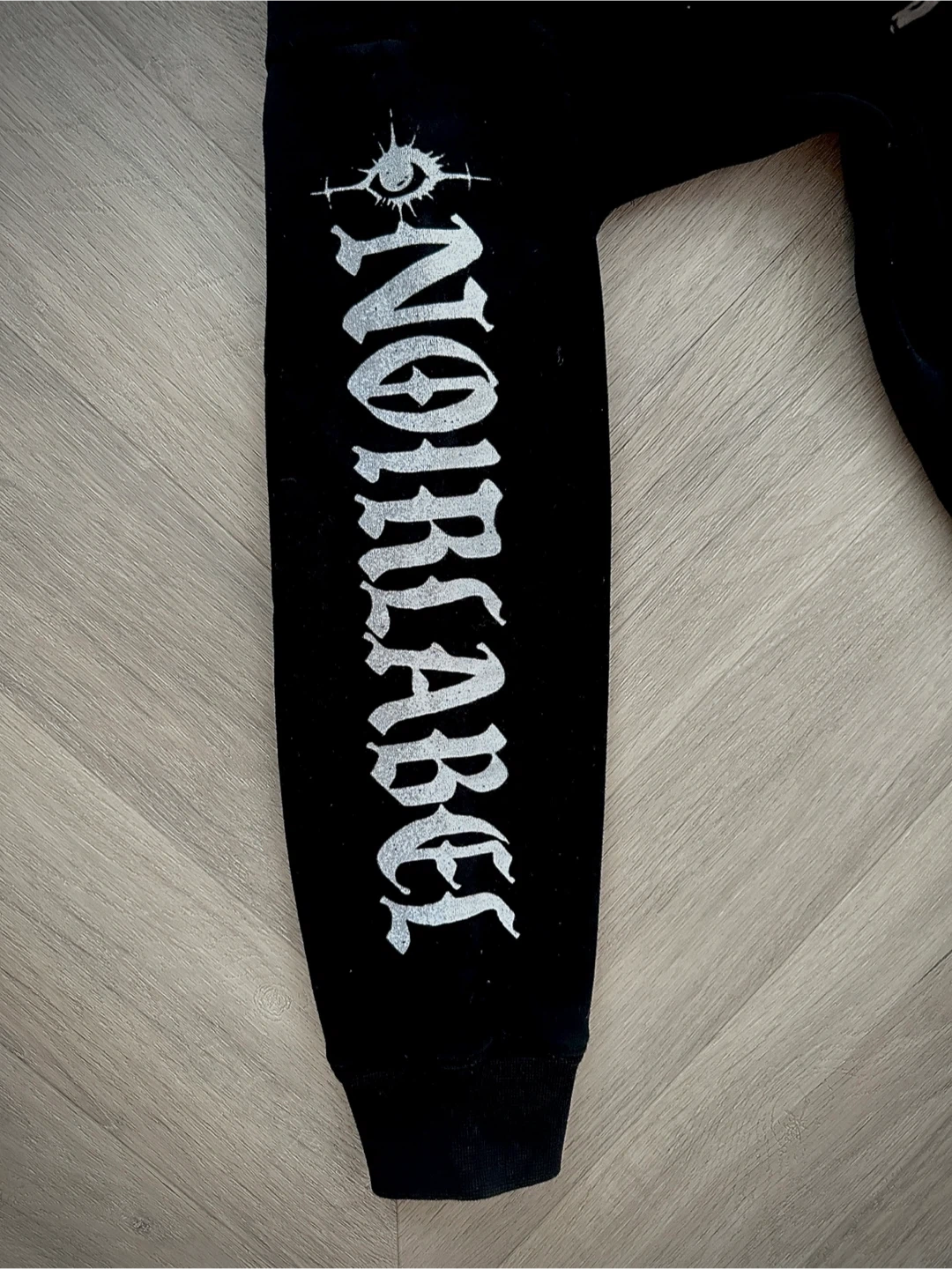 Selling a Noirlabel black hoodie. The hoodie features graphics on the front, back, and sleeves. It's in great condition! All sizes available!