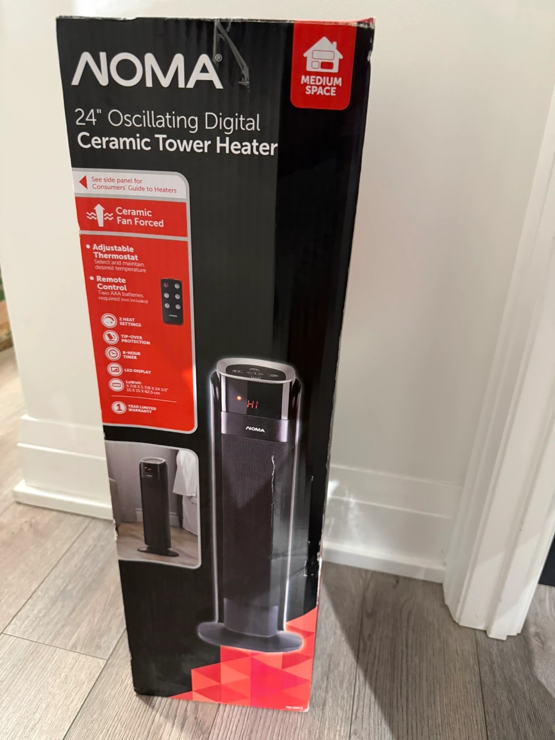 Selling a brand new NOMA 24" Oscillating Digital Ceramic Tower Heater! It's still in its original box. This tower heater is perfect for medium spaces and features: - Ceramic fan forced heating - Adjustable thermostat for maintaining your desired temperature - Remote control (batteries not included) - 2 heat settings - Tip-over protection - Timer - LED display