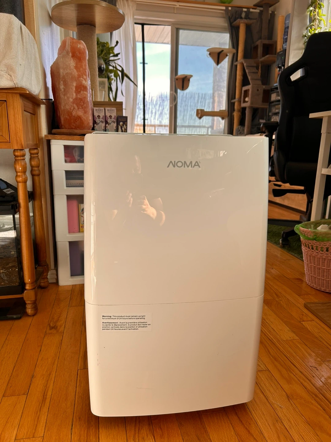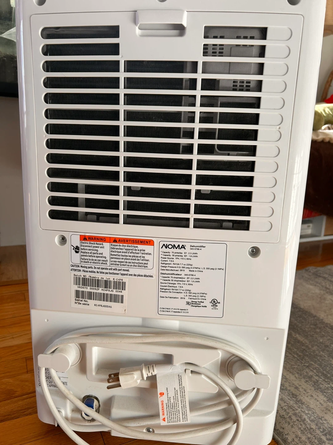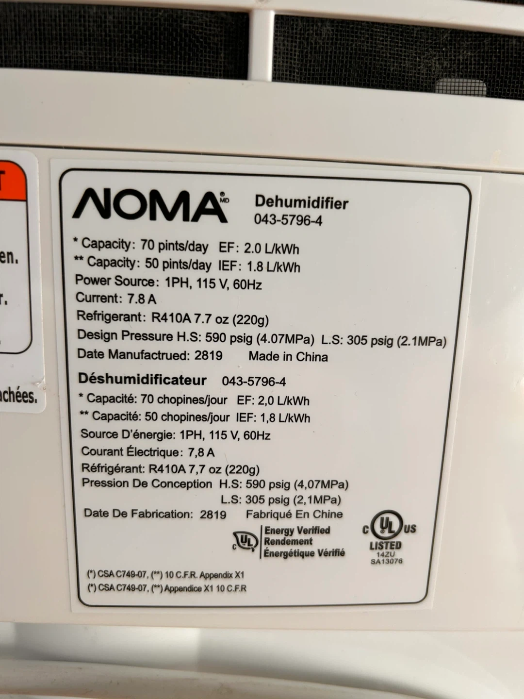 Selling a NOMA dehumidifier that can handle up to 70 pints! It's in great shape and ready to help keep your place nice and dry. Includes the hose, and manual. The hose is unused. I just waited until it notified me it needed to be emptied and easily pulled the compartment out and used the handle to dump it out.