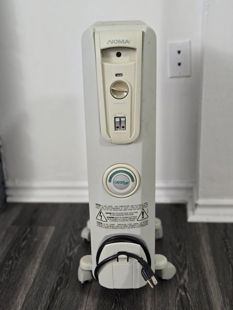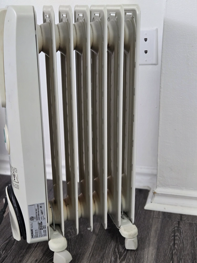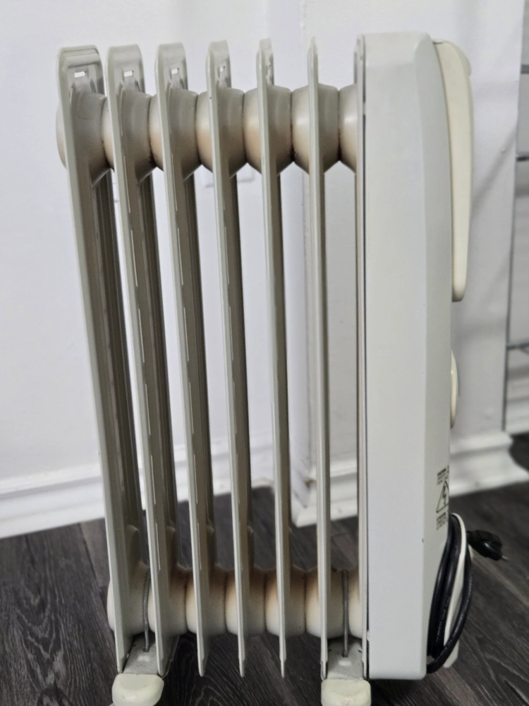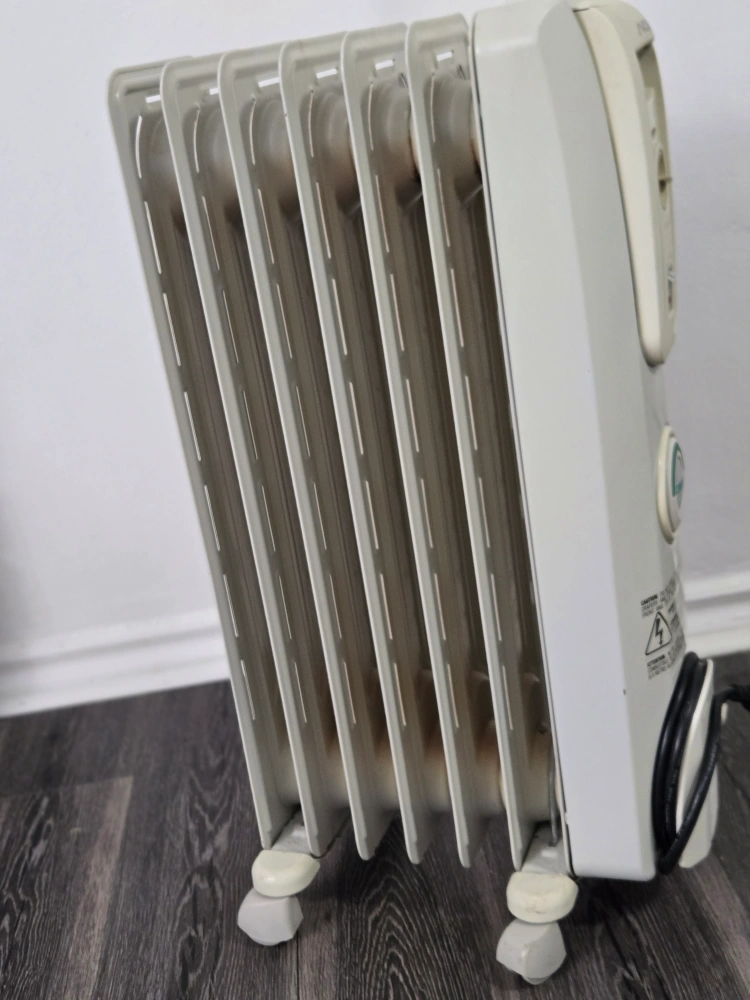 Used electric radiator heater. Features multiple heat settings and overheat protection. Shows some signs of use.