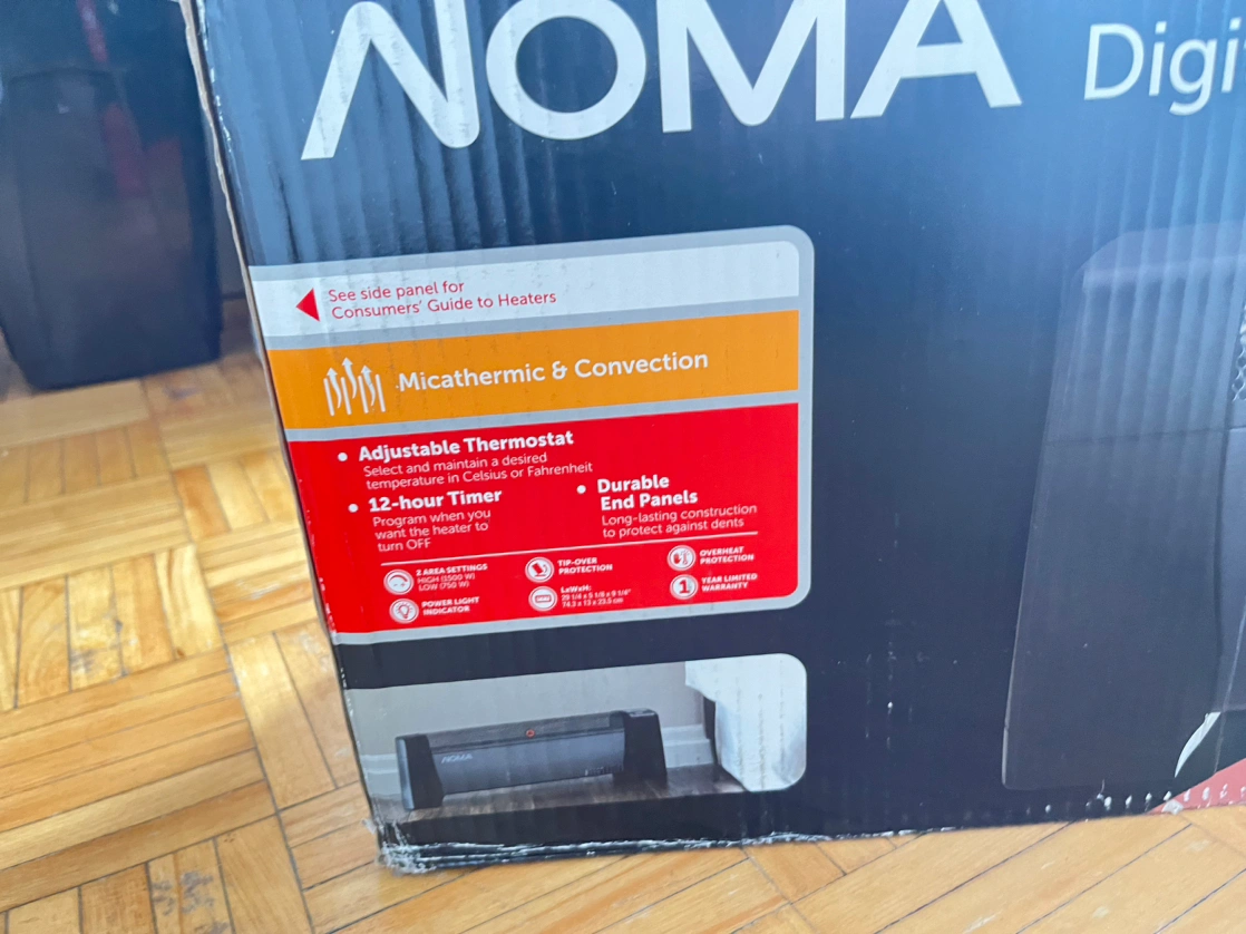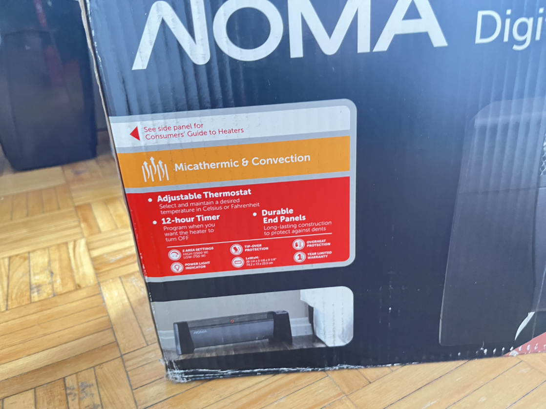 - features two heat settings and an adjustable thermostat - stay cool body with dent proof end panels - convection heater with silent operation - tip-over protection (if this electric space heater gets tipped over during operation, it will automatically shut off to help prevent a fire hazard) - pick up near Eglington station