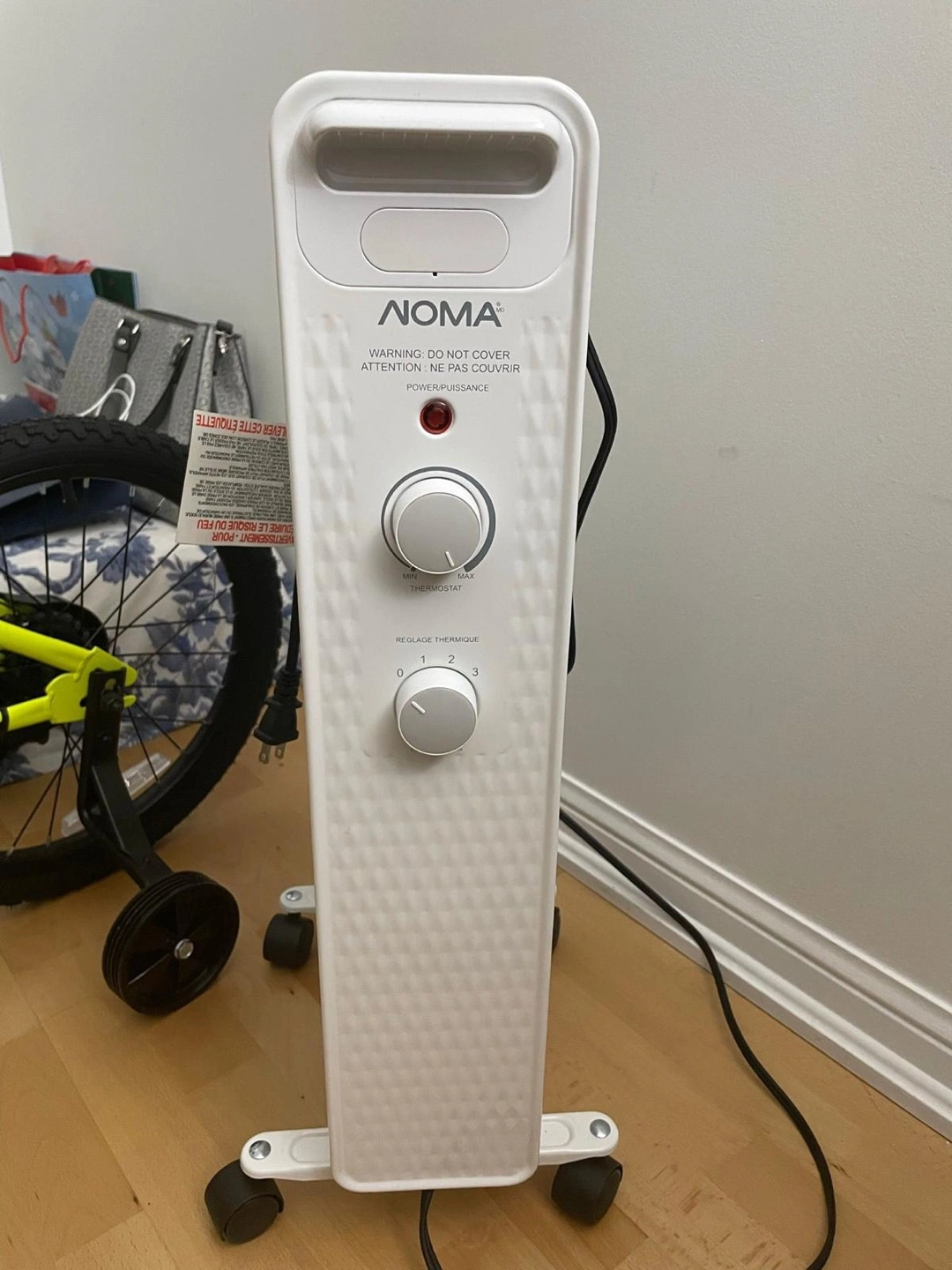 BNIB White electric heater with wheels. Has two knobs for temperature and power control. Return period expired so available here.