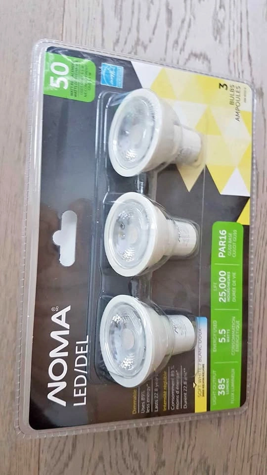 NOMA LED light bulbs pack of 3. Dimmable, uses 89% less energy, lasts 22.8 years. Soft white. Energy star. Ideal for Track & recessed lighting. New in original package. I am selling 8 packs at $11 each pack.