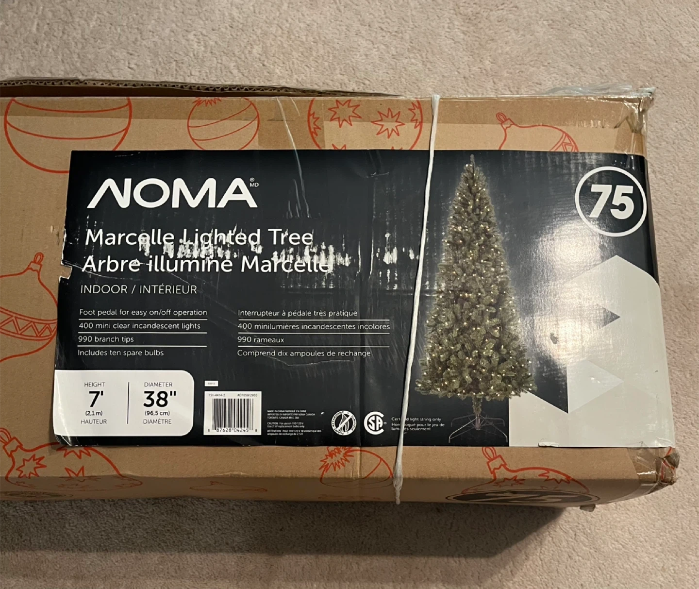 Pick up in Alliston. Selling a NOMA Marcelle Slim Lighted Tree, standing at 7 feet tall! It's an indoor tree with 400 mini clear incandescent lights and 990 branch tips. The diameter is 38 inches. Comes with a foot pedal for easy on/off operation.