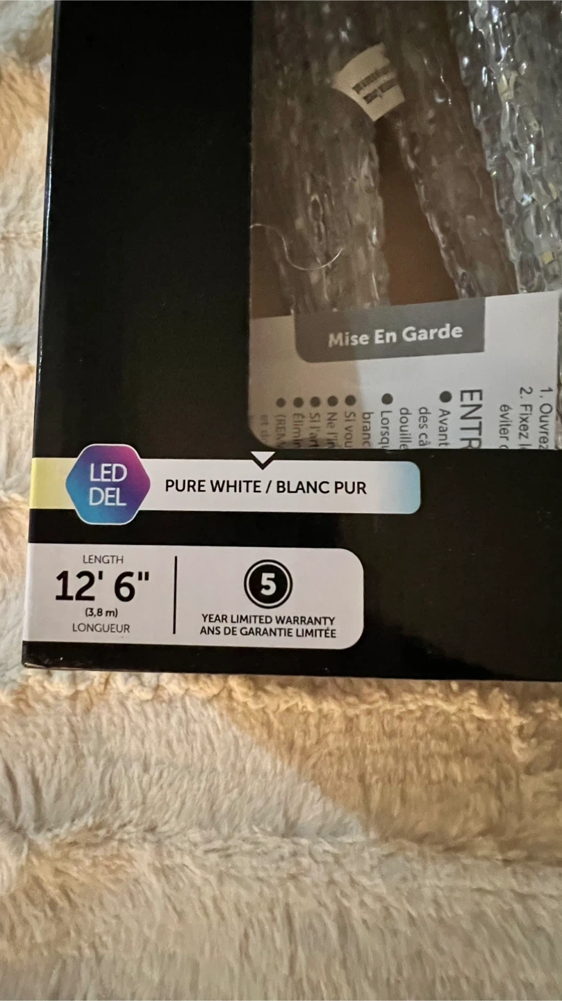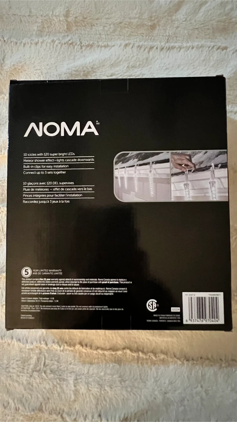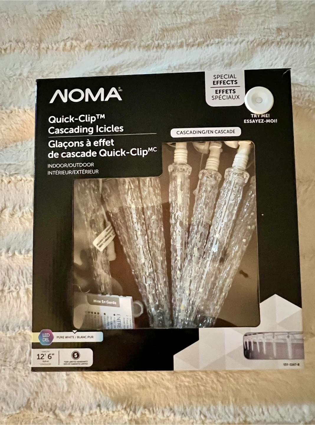 Noma Quick-Clip Cascading Icicles Brand new in a box String length is 12' 6" (3.8 m) and features 10 icicles with 120 super bright LEDs, creating a beautiful meteor shower effect. Easy to install with built-in clip. Connectable up to 3 sets together. Perfect for indoor or outdoor use.